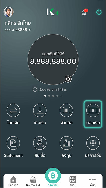 เข้าแอป K PLUS เลือก "ธุรกรรม"