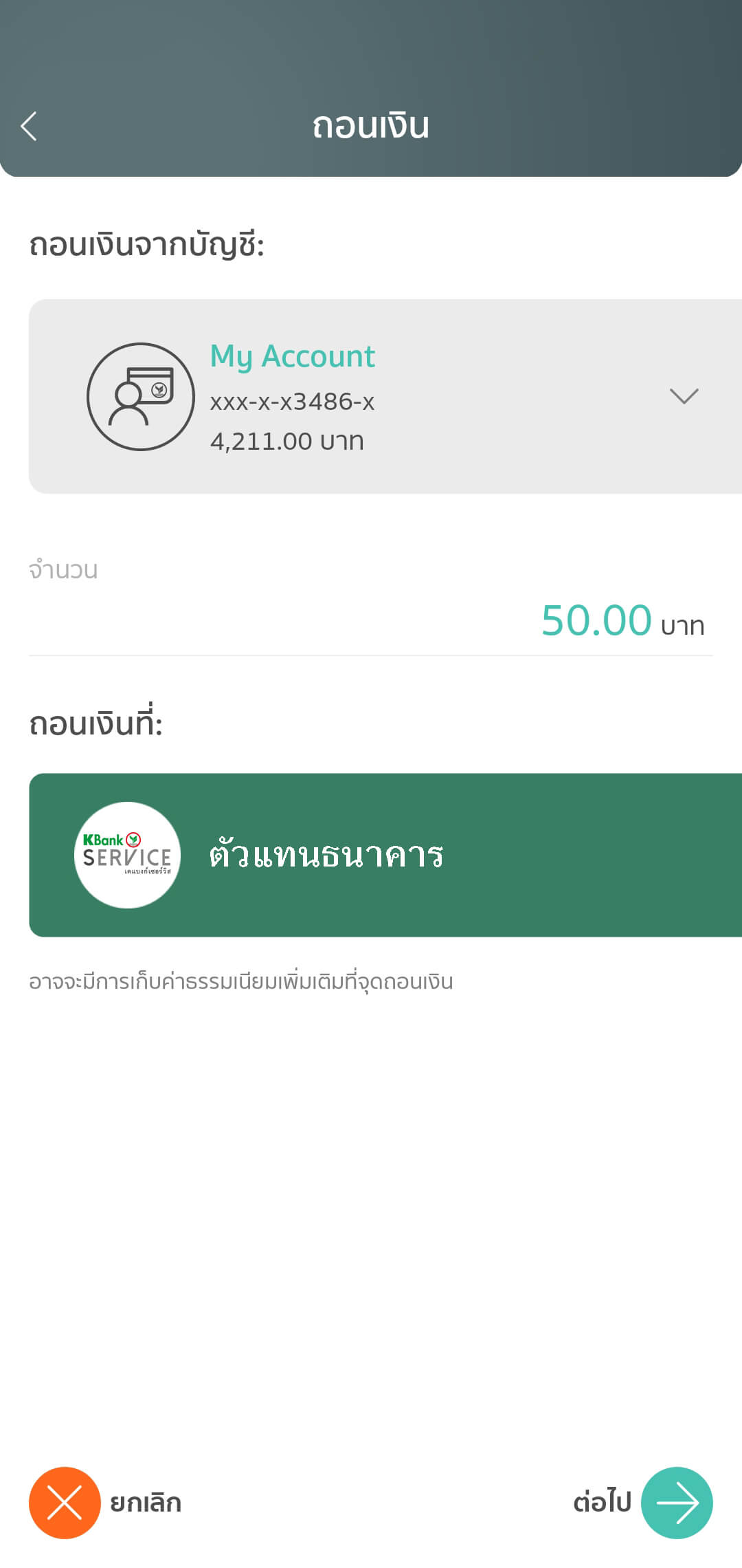 เพียงเข้าแอป KPLUS เลือก ถอนเงิน และเลือก ตัวแทนธนาคาร ที่ต้องการทำรายการ หลังจากนั้นสามารถดำเนินการถอนเงินผ่านตัวแทนธนาคารได้ทันที