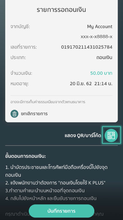 - ถอนเงินสดได้ตั้งแต่ 1 - 3,000 บาท ต่อรายการ ต่อวัน ต่อหมายเลขบัตรประชาชน ถอนเงินได้เฉพาะบัญชีออมทรัพย์ และบัญชีกระแสรายวัน ธนาคารกสิกรไทยเท่านั้น