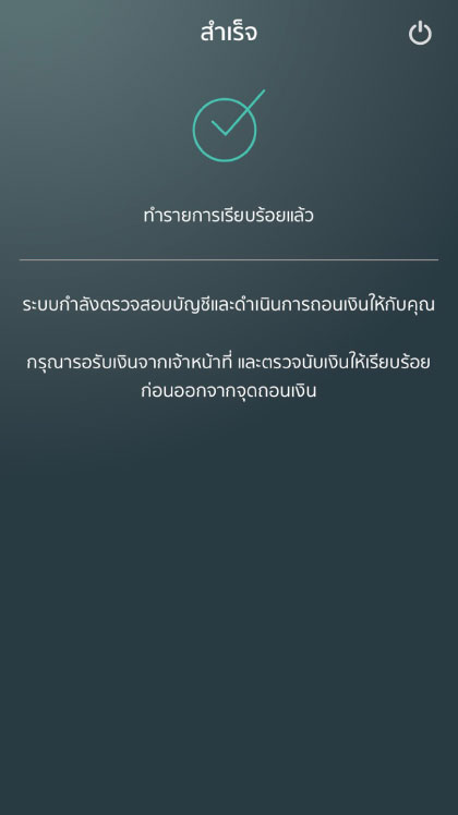 ขั้นตอนที่ 6 / 6 ทำรายการสำเร็จ เครื่องแสดงข้อความ ”ธนาคารตรวจสอบข้อมูลของท่านเรียบร้อย แล้ว” ให้ดึงบัตรประชาชนออก และ รับสลิปรายการ |