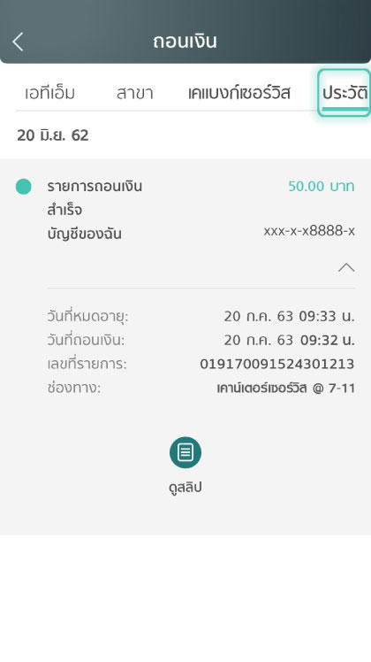 สามารถ "เรียกดูรายละเอียดการถอนเงิน" ได้ที่ประวัติ