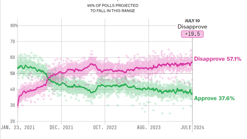 หลังจากการดีเบตครั้งแรกในวันที่ 27 มิถุนายนที่ผ่านมา ในภาพรวมทรัมป์แสดงผลงานการดีเบตได้ดีกว่าไบเดน เนื่องจากไบเดนมีปัญหาด้านสุขภาพจากอายุที่มากขึ้นและมีการตอบคำถามไม่ตรงประเด็นในบางเรื่อง ทำให้หลังจบการดีเบต ผลคะแนนของไบเดนลดลงต่ำกว่าระดับ 40% และลดลงต่อเนื่องหลังการดีเบต