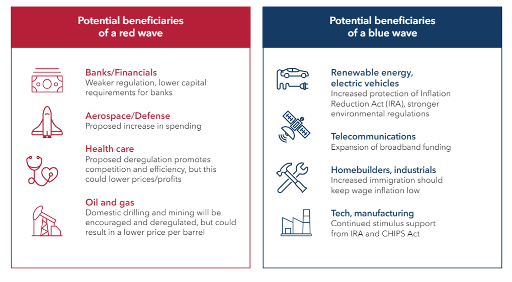 พรรคการเมืองแต่ละพรรคจะมีนโยบายที่ส่งผลดีต่อหุ้นในอุตสาหกรรมที่แตกต่างกัน โดยถ้าพรรค Republican ชนะการเลือกตั้ง จะส่งผลดีต่อหุ้นกลุ่มธนาคารและการเงิน หุ้นกลุ่มบริการทางการแพทย์ หุ้นอุตสาหกรรมป้องกันประเทศและอวกาศ หุ้นบริษัทเทคโนโลยีขนาดใหญ่และหุ้นอุตสาหกรรมน้ำมันเละก๊าซธรรมชาติ จากนโยบายที่เน้นด้านการลดภาษีบริษัทขนาดใหญ่และลดการตรวจสอบควบคุมลง หรือถ้าพรรค Democrat ชนะการเลือกตั้ง จะส่งผลดีต่อหุ้นกลุ่มพลังงานสะอาด หุ้นกลุ่มอุตสาหกรรมการผลิต โดยเฉพาะอุตสาหกรรมเซมิคอนดักเตอร์และหุ้นกลุ่มโทรคมนาคม จากนโยบายสนับสนุนพลังงานสะอาด โครงการพัฒนาโครงสร้างพื้นฐานสำคัญที่เกี่ยวข้อง และสานต่อนโยบาย Inflation Reduction Act