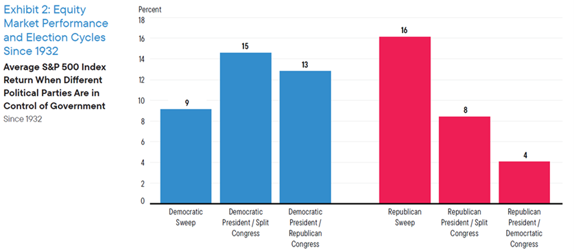 จากสถิติการเลือกตั้งสหรัฐฯ นับตั้งแต่ปี 1932 ที่ผ่านมาตลาดหุ้นดัชนี S&P500 มักจะทำผลงานได้ดีที่สุดเมื่อพรรค Republican ได้ทั้งตำแหน่งประธานาธิบดีและครองสภา ได้ผลตอบแทนเฉลี่ย 16% เนื่องจากฝั่ง Republican มีนโยบายที่สนับสนุนตลาดทุนมากกว่า แต่ถ้ามีการแบ่งสภาเกิดขึ้น ควรที่จะเป็นกรณีที่ Democrat ได้ตำแหน่งประธานาธิบดี จะสร้างผลตอบแทนได้ราว 15% แต่ถ้าพรรค Republican ได้ประธานาธิบดี แต่พรรค Democrat ครองสภา ตลาดหุ้นจะสร้างผลตอบแทนได้เพียงแค่ 4% เป็นฉากทัศน์ที่นักลงทุนไม่อยากให้เกิดขึ้น