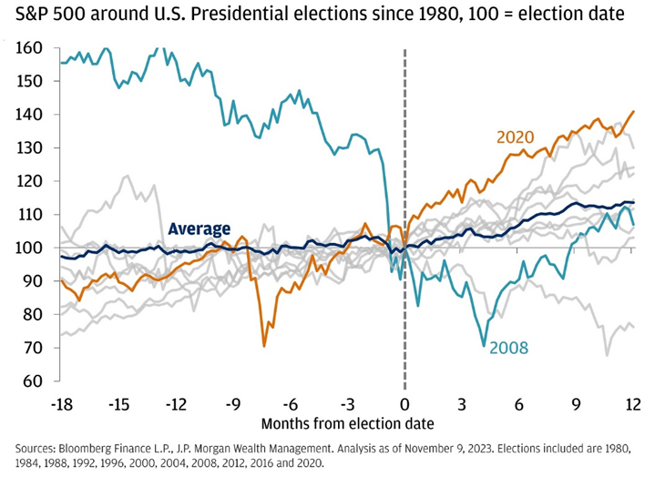 และมองจากสถิติตลาดหุ้นสหรัฐฯ ในอดีตตั้งแต่ปี 1980 ดัชนี S&P500 จะมีความผันผวนในช่วงก่อนการเลือกตั้งประมาณ 1 - 3 เดือน จากความไม่แน่นอนทางการเมือง แต่จะกลับมาสร้างผลตอบแทนได้ดีหลังจากผ่านเลือกตั้งไปแล้ว ซึ่งมาจากนโยบายต่าง ๆ ที่มีความชัดเจนและการเมืองที่มีเสถียรภาพมากขึ้นหลังการเลือกตั้ง