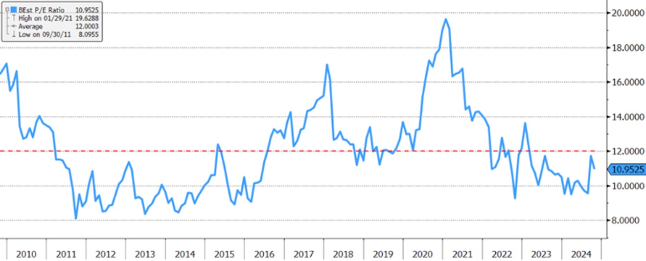 กราฟ : ค่าเฉลี่ย P/E ย้อนหลัง 15 ปี ของดัชนีหุ้นจีน MSCI China Index