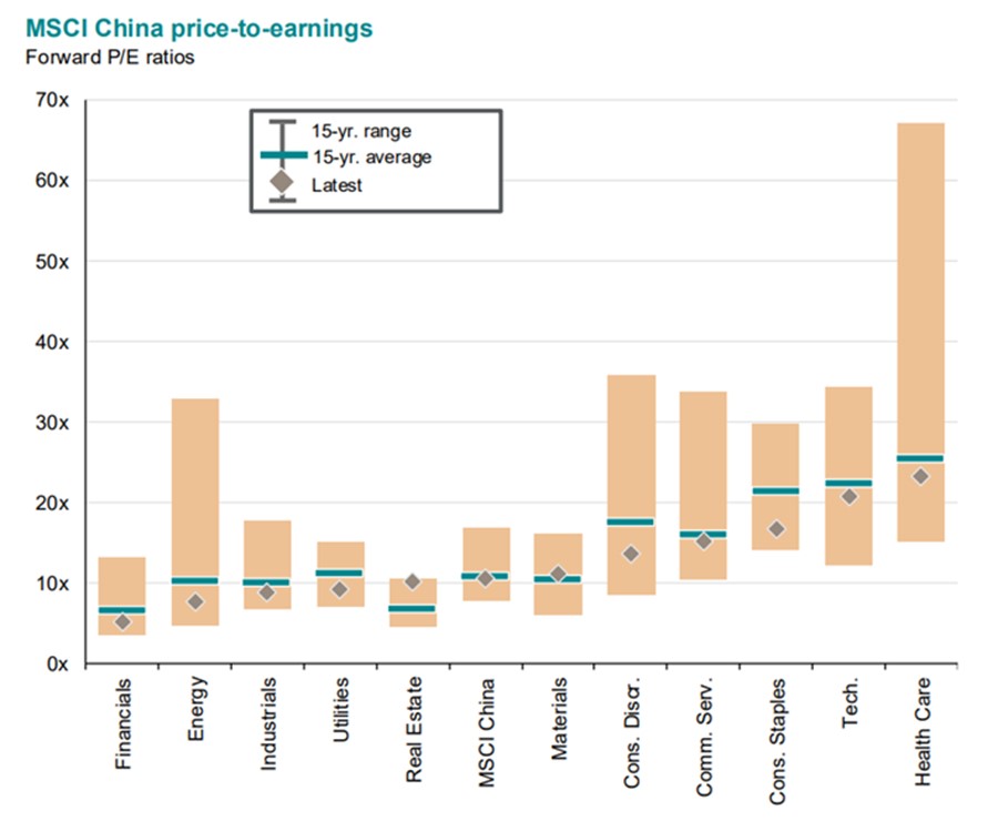 กราฟ : ค่าเฉลี่ย P/E ย้อนหลัง 15 ปี ของกลุ่มอุตสาหกรรมต่างๆ ใน MSCI China Index