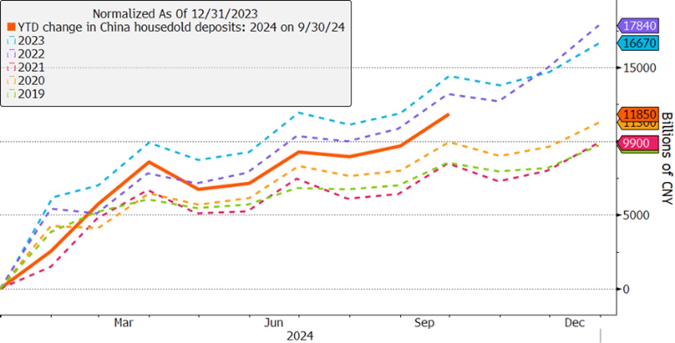 กราฟเปรียบเทียบปริมาณเงินออมสะสมของครัวเรือนจีนตั้งแต่ปี 2019 - เดือนสิ้นเดือนกันยายน 2024