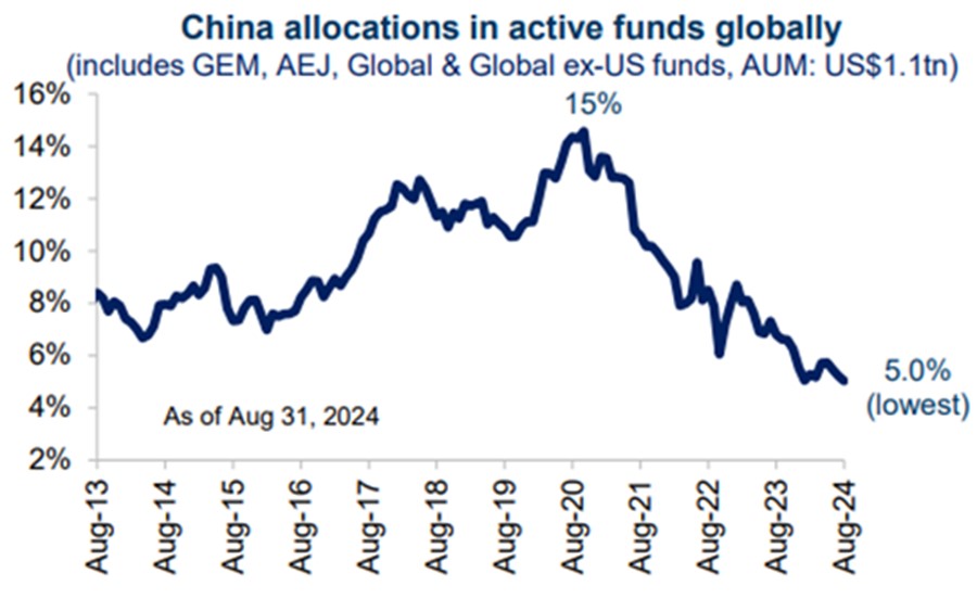 3. ศักยภาพในการกลับมาของเม็ดเงินลงทุนสถาบันเมื่อเศรษฐกิจจีนฟื้นตัว จากข้อมูลในกราฟแสดงถึงสัดส่วนการจัดสรรเงินลงทุนในจีนของกองทุนที่มีนโยบายเชิงรุกทั่วโลก (Active Funds) ตั้งแต่ช่วงเดือนสิงหาคม 2013 ถึงสิงหาคม 2024 โดยในช่วงที่เศรษฐกิจจีนเติบโต กองทุนให้น้ำหนักการลงทุนในหุ้นจีนสูงถึง 15% (Overweight) และเมื่อเศรษฐกิจจีนชะลอตัวลง โดยเฉพาะในช่วงหลังวิกฤติ สัดส่วนการจัดสรรเงินลงทุนในจีนของกองทุนเชิงรุกทั่วโลกอยู่ที่ 5% ซึ่งเป็นระดับที่ต่ำที่สุดในรอบหลายปี (Underweight) อย่างไรก็ตาม หากเศรษฐกิจจีนเริ่มแสดงสัญญาณการฟื้นตัว กองทุนเหล่านี้ก็มีแนวโน้มที่จะปรับเพิ่มสัดส่วนการลงทุนในหุ้นจีนอีกครั้ง ซึ่งการเพิ่มขึ้นของเม็ดเงินลงทุนจะเป็นแรงขับเคลื่อนที่สำคัญสำหรับราคาหุ้นและดัชนีตลาด