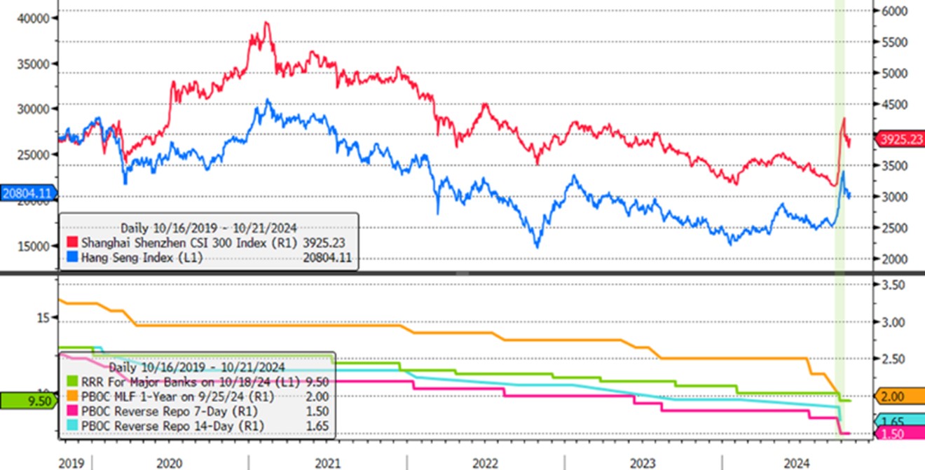 จากกราฟจะเห็นว่าช่วงสัปดาห์สุดท้ายก่อนเข้าสู่เทศกาลหยุดยาวของจีน (Golden Week) ตลาดหุ้นตอบรับมาตรการด้านนโยบายการเงินโดยปรับตัวขึ้นมาอย่างรวดเร็ว ก่อนความผันผวนในช่วงถัดมาหลังมาตรการที่ประกาศออกมาเพิ่มเติม ยังไม่สามารถสร้างความมั่นใจให้กับนักลงทุนเพิ่มขึ้นได้