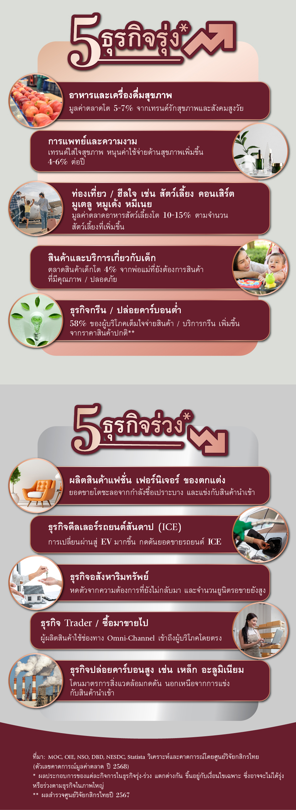 - 5 ธุรกิจรุ่ง ได้แก่ อาหารและเครื่องดื่มสุขภาพ, การแพทย์และความงาม, ท่องเที่ยว/ฮีลใจ, สินค้าและบริการเด็ก, ธุรกิจกรีน/ปล่อยคาร์บอนต่ำ