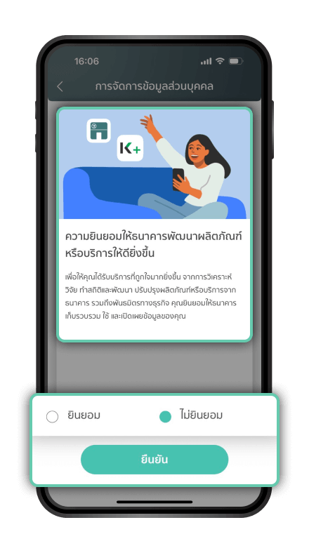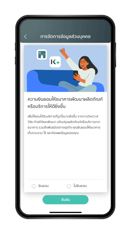 กรณีเลือก“ความยินยอมให้ธนาคาร พัฒนาผลิตภัณฑ์หรือบริการให้ดียิ่งขึ้น” และเลือก “ยินยอม” หรือ “ไม่ยินยอม” แล้วกด “ยืนยัน”