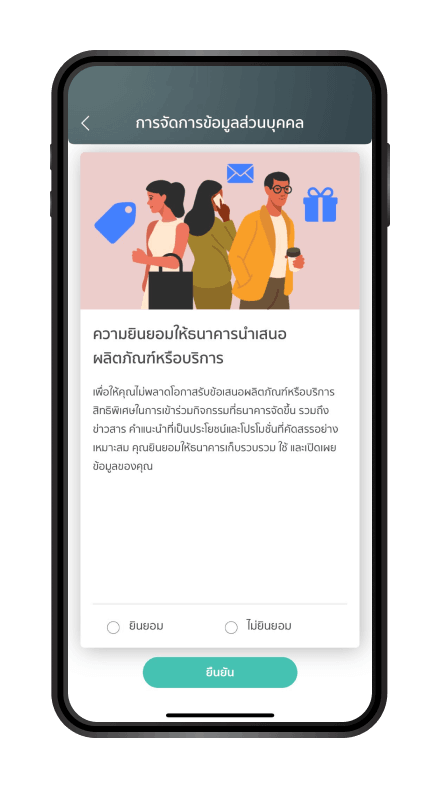กรณีเลือก“ความยินยอมให้ธนาคาร นำเสนอผลิตภัณฑ์หรือบริการ” และเลือก “ยินยอม” หรือ “ไม่ยินยอม” แล้วกด “ยืนยัน”