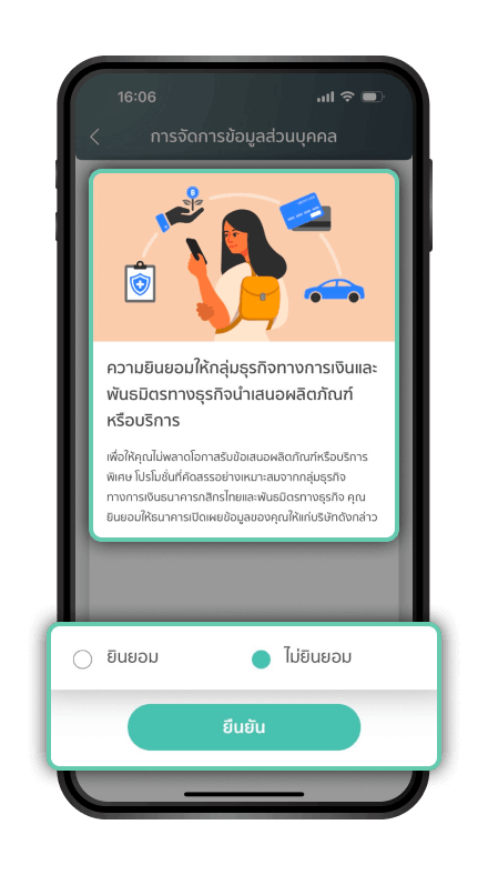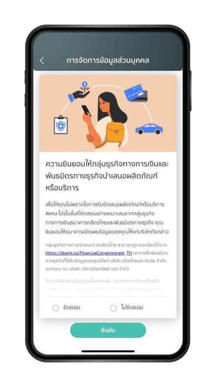 กรณีเลือก“ความยินยอมให้กลุ่มธุรกิจทางการเงินและพันธมิตรทางธุรกิจ นำเสนอผลิตภัณฑ์หรือบริการ” และเลือก “ยินยอม” หรือ “ไม่ยินยอม” แล้วกด “ยืนยัน”