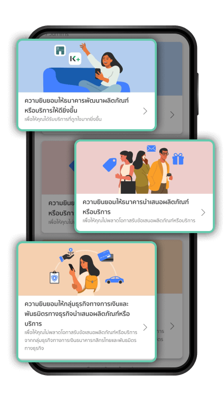 ท่านสามารถถอนหรือเปลี่ยนแปลงความยินยอมที่ท่านได้เคยให้ไว้กับธนาคาร ผ่านแอปพลิเคชัน K PLUS และ K-Contact Center โทร. 02-8888888