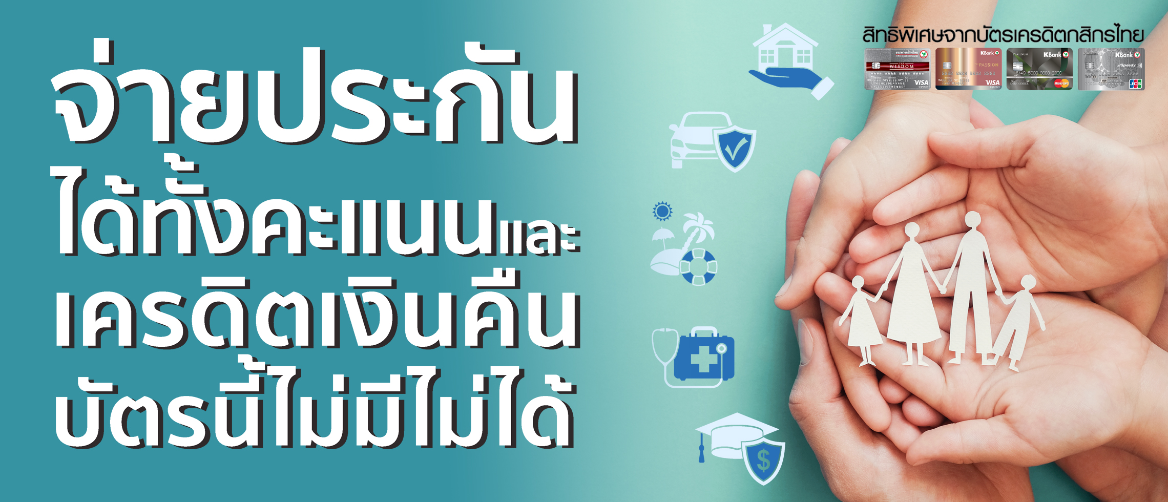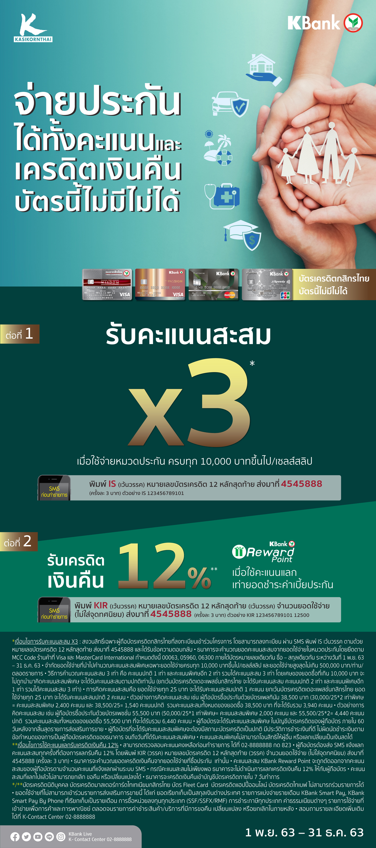จ่ายประกันได้ทั้งคะแนน และเครดิตเงินคืน บัตรนี้ไม่มีไม่ได้ วันนี้ - 31 ธ.ค. 63 จ่ายประกันได้ทั้งคะแนน และเครดิตเงินคืน บัตรนี้ไม่มีไม่ได้ ต่อที่ 1 รับคะแนนสะสม X3* เมื่อใช้จ่ายหมวดประกัน ครบทุก 10,000 บาทขึ้นไป/เซลส์สลิป ลงทะเบียนผ่าน SMSพิมพ์ IS เว้นวรรค ตามด้วยหมายเลขบัตรเครดิต 12 หลักสุดท้าย ส่งมาที่ 4545888 (ครั้งละ 3 บาท) ตัวอย่าง IS 123456789101 ต่อที่ 2 รับเครดิตเงินคืน 12%** เมื่อใช้คะแนน KBank Reward Point แลกเท่ายอดชำระเบี้ยประกัน วิธีการแลกคะแนน สำหรับเมืองไทยประกันชีวิตSMS พิมพ์ MTL (เว้นวรรค) หมายเลขบัตรเครดิต 12 หลักสุดท้าย (วรรค) จำนวนยอดใช้จ่าย (ไม่ใส่จุดทศนิยม) ส่งมาที่ 4545 888 (ครั้งละ 3 บาท) ตัวอย่าง คุณ ก. ใช้จ่ายผ่านบัตร 12,500.50 บาท ด้วยบัตรหมายเลข xxxx1234567899999 คุณ ก. ต้องส่ง SMS พิมพ์ MTL 1234567899999 12500 แล้วส่งมาที่ 4545888 สำหรับประกันอื่นๆSMS พิมพ์ KIR (เว้นวรรค) หมายเลขบัตรเครดิต 12 หลักสุดท้าย (วรรค) จำนวนยอดใช้จ่าย (ไม่ใส่จุดทศนิยม) ส่งมาที่ 4545 888 (ครั้งละ 3 บาท) ตัวอย่าง คุณ ก. ใช้จ่ายผ่านบัตร 12,500.50 บาท ด้วยบัตรหมายเลข xxxx1234567899999 คุณ ก.ต้องส่ง SMS พิมพ์ KIR 1234567899999 12500 แล้วส่งมาที่ 4545888 รายละเอียดเพิ่มเติม คลิก เงื่อนไข *เงื่อนไขการรับคะแนนสะสม X3 สงวนสิทธิ์เฉพาะผู้ถือบัตรเครดิตกสิกรไทยที่ลงทะเบียนเข้าร่วมโครงการ โดยสามารถลงทะเบียน ผ่าน SMS พิมพ์ IS เว้นวรรค ตามด้วยหมายเลขบัตรเครดิต 12 หลักสุดท้าย ส่งมาที่ 4545888 และได้รับข้อความตอบกลับ ธนาคารจะคำนวณยอดคะแนนสะสมจากยอดใช้จ่ายในหมวดประกันโดยยึดตาม MCC Code ร้านค้าที่ Visa และ MasterCard International กำหนดดังนี้ 00063, 05960, 06300 ภายใต้บัตรหมายเลขเดียวกัน ชื่อ – สกุลเดียวกัน ระหว่างวันที่ 1 พ.ย. 63 – 31 ธ.ค. 63 จำกัดยอดใช้จ่ายที่นำไปคำนวณคะแนนสะสมพิเศษเฉพาะยอดใช้จ่ายครบทุก 10,000 บาทขึ้นไป/เซลส์สลิป และยอดใช้จ่ายสูงสุดไม่เกิน 500,000 บาท/ท่าน/ตลอดรายการวิธีการคำนวณคะแนนสะสม 3 เท่า คือ คะแนนปกติ 1 เท่า และคะแนนพิเศษอีก 2 เท่า รวมได้คะแนนสะสม 3 เท่า โดยเศษของยอดซื้อที่เกิน 10,000 บาทจะไม่ถูกนำมาคิดคะแนนสะสมพิเศษ จะได้รับคะแนนสะสมตามปกติเท่านั้น (ยกเว้นบัตรเครดิตเดอะแพสชั่นกสิกรไทย จะได้รับคะแนนสะสม คะแนนปกติ 2 เท่า และคะแนนพิเศษอีก 1 เท่า รวมได้คะแนนสะสม 3 เท่า) การคิดคะแนนสะสมคือ ยอดใช้จ่ายทุก 25 บาท จะได้รับคะแนนสะสมปกติ 1 คะแนน ยกเว้นบัตรเครดิตเดอะแพสชั่นกสิกรไทย ยอดใช้จ่ายทุก 25 บาท จะได้รับคะแนนสะสมปกติ 2 คะแนน ตัวอย่างการคิดคะแนนสะสม เช่น ผู้ถือบัตรซื้อประกันด้วยบัตรแพลทินัม 38,500 บาท (30,000/25*2 เท่าพิเศษ= คะแนนสะสมพิเศษ 2,400 คะแนน และ 38,500/25= 1,540 คะแนนปกติ รวมคะแนนสะสมทั้งหมดของยอดซื้อ 38,500 บาท ที่จะได้รับรวม 3,940 คะแนน ตัวอย่างการคิดคะแนนส
