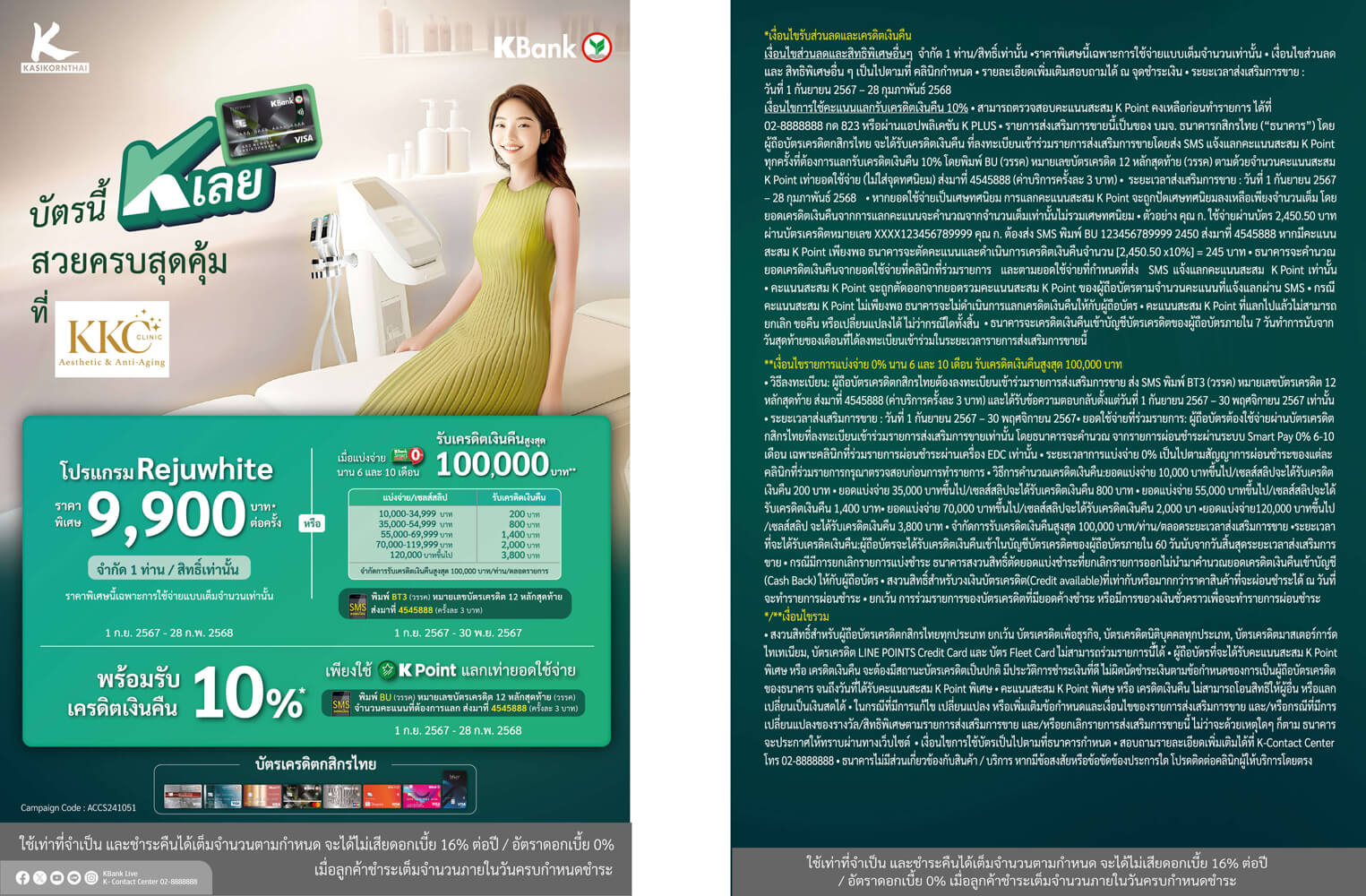 - สงวนสิทธิ์สำหรับผู้ถือบัตรเครดิตกสิกรไทยทุกประเภท ยกเว้น บัตรเครดิตเพื่อธุรกิจ, บัตรเครดิตนิติบุคคลทุกประเภท, บัตรเครดิตมาสเตอร์การ์ดไทเทเนียม, บัตรเครดิต LINE POINTS Credit Card และ บัตร Fleet Card ไม่สามารถร่วมรายการนี้ได้