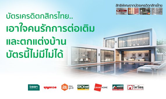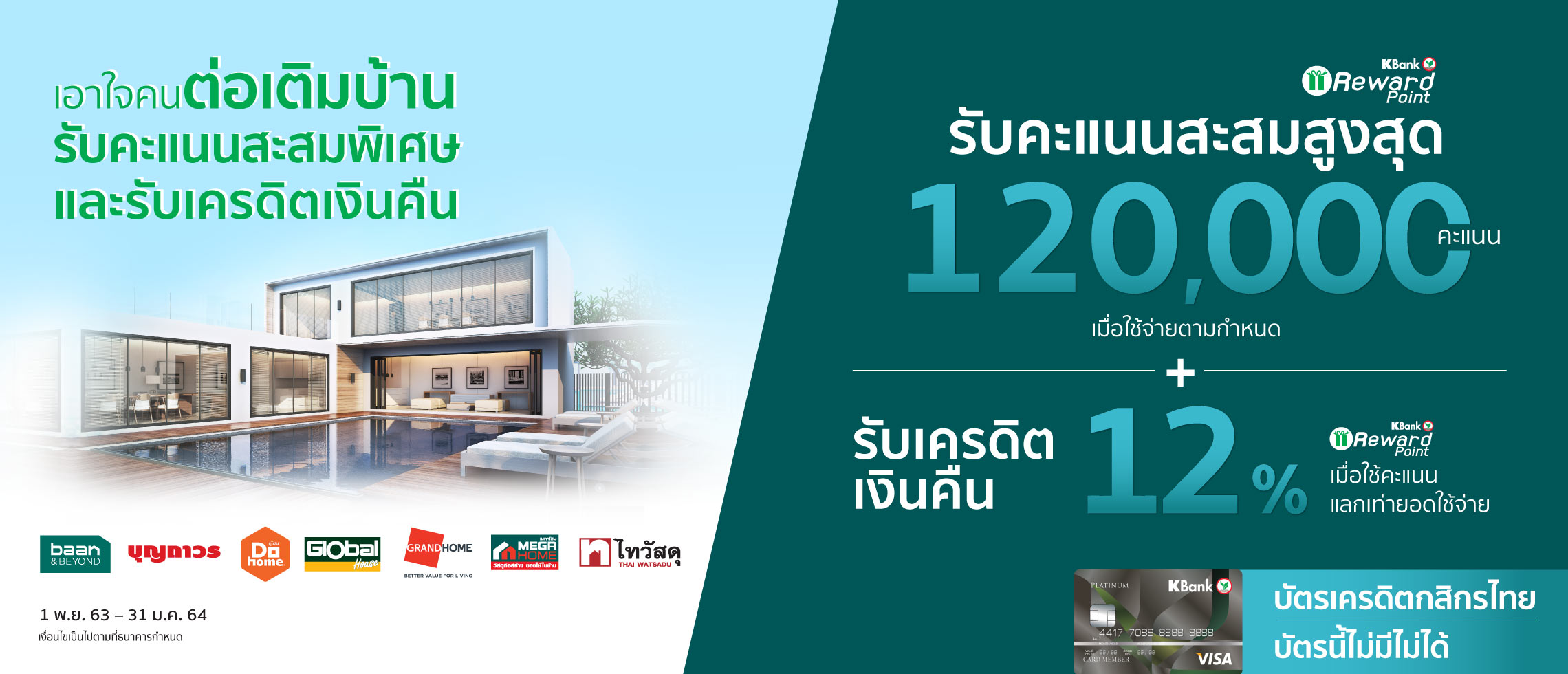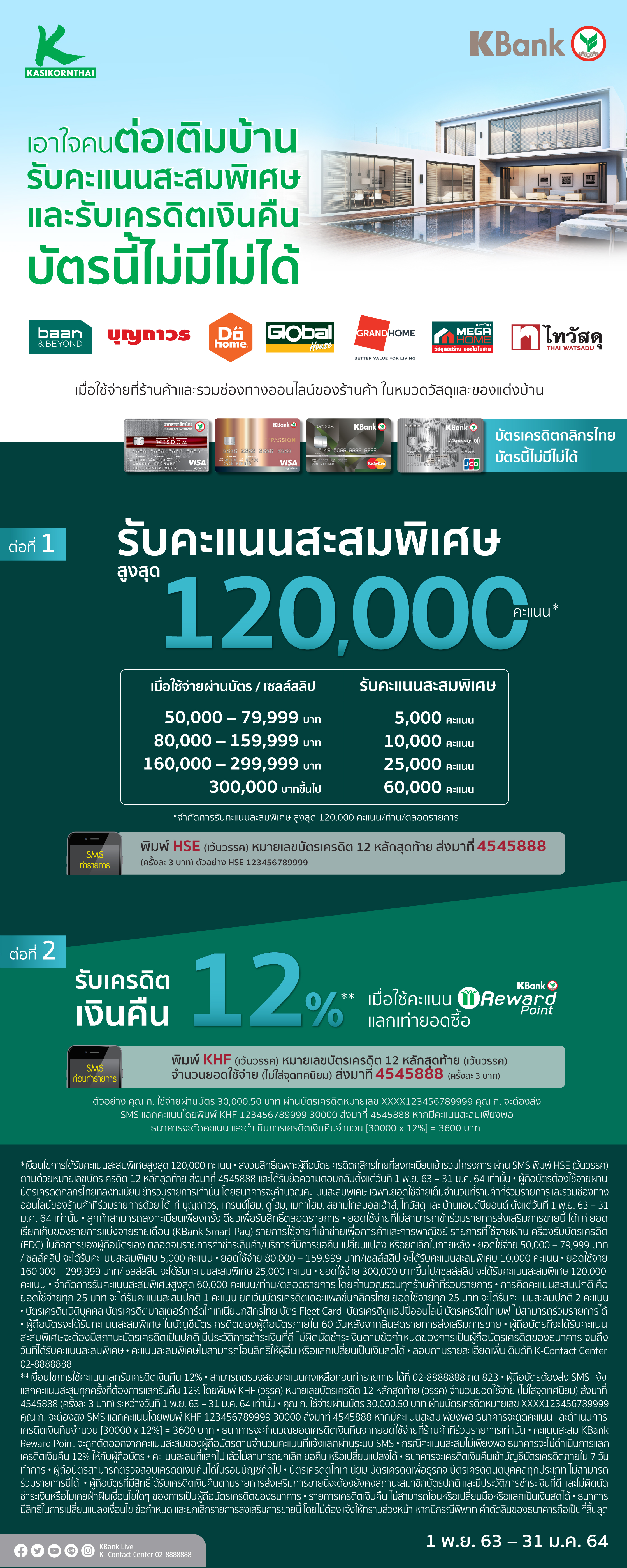 บัตรเครดิตกสิกรไทย..เอาใจคนรักการต่อเติมและตกแต่งบ้าน วันนี้ - 31 ม.ค. 64 บัตรเครดิตกสิกรไทย..เอาใจคนรักการต่อเติมและตกแต่งบ้าน บัตรเครดิตกสิกรไทย..เอาใจคนรักการต่อเติมและตกแต่งบ้าน รับคะแนนสะสมพิเศษสูงสุด 120,000 คะแนน เมื่อใช้จ่ายที่ ร้านค้าและรวมช่องทางออนไลน์ของร้านค้า ในหมวดวัสดุและของแต่งบ้าน พิเศษที่ 1 รับคะแนนสะสมพิเศษ สูงสุด 120,000 คะแนน* เมื่อใช้จ่ายผ่านบัตร/เซลส์สลิป รับคะแนนสะสมพิเศษ50,000 – 79,9995,000 คะแนน80,000 – 159,99910,000 คะแนน160,000 – 299,99925,000 คะแนน300,000 บาทขึ้นไป60,000 คะแนน *จำกัดการรับคะแนนสะสมพิเศษ สูงสุด 120,000 คะแนน/ท่าน/ตลอดรายการ SMS ลงทะเบียนร่วมรายการ พิมพ์ HSE เว้นวรรค ตามด้วยหมายเลขบัตรเครดิต 12 หลักสุดท้าย ส่งมาที่ 4545888 พิเศษที่ 2 รับเครดิตเงินคืน 12%** จากคะแนนที่แลก เพียงใช้คะแนน KBank Reward Point วิธีการส่ง SMS แลกคะแนนSMS พิมพ์ KHF (วรรค) ตามด้วยหมายเลขบัตรเครดิต 12 หลักสุดท้าย (วรรค) จำนวนยอดใช้จ่าย [ไม่ใส่จุดทศนิยม] ส่งมาที่ 4545888 (ครั้งละ 3 บาท) ตัวอย่าง คุณ ก. ใช้จ่ายผ่านบัตร 30,000.50 บาท ผ่านบัตรเครดิตหมายเลข XXXX123456789999 คุณ ก. จะต้องส่ง SMS แลกคะแนนโดยพิมพ์ KHF 123456789999 30000 ส่งมาที่ 4545888 หากมีคะแนนสะสมเพียงพอ ธนาคารจะตัดคะแนน และดำเนินการเครดิตเงินคืนจำนวน [30000 x 12%] = 3600 บาท รายละเอียดเพิ่มเติม คลิก เงื่อนไข *เงื่อนไขการได้รับคะแนนสะสมพิเศษสูงสุด 120,000 คะแนน สงวนสิทธิ์เฉพาะผู้ถือบัตรเครดิตกสิกรไทยที่ลงทะเบียนเข้าร่วมโครงการ ผ่าน SMS พิมพ์ HSE (ว้นวรรค) ตามด้วยหมายเลขบัตรเครดิต 12 หลักสุดท้าย ส่งมาที่ 4545888 และได้รับข้อความตอบกลับตั้งแต่วันที่ 1 พ.ย. 63 – 31 ม.ค. 64 เท่านั้น ผู้ถือบัตรต้องใช้จ่ายผ่านบัตรเครดิตกสิกรไทยที่ลงทะเบียนเข้าร่วมรายการเท่านั้น โดยธนาคารจะคำนวณคะแนนสะสมพิเศษ เฉพาะยอดใช้จ่ายเต็มจำนวนที่ร้านค้าที่ร่วมรายการและรวมช่องทางออนไลน์ของร้านค้าที่ร่วมรายการด้วย ตั้งแต่วันที่ 1 พ.ย. 63 – 31 ม.ค. 64 เท่านั้น ได้แก่ บุญถาวร, แกรนด์โฮม, ดูโฮม, เมกาโฮม, สยามโกลบอลเฮ้าส์, ไทวัสดุ และ บ้านแอนด์บียอนด์ ลูกค้าสามารถลงทะเบียนเพียงครั้งเดียวเพื่อรับสิทธิ์ตลอดรายการ ยอดใช้จ่ายที่ไม่สามารถเข้าร่วมรายการส่งเสริมการขายนี้ ได้แก่ ยอดเรียกเก็บของรายการแบ่งจ่ายรายเดือน (KBank Smart Pay) รายการใช้จ่ายที่เข้าข่ายเพื่อการค้าและการพาณิชย์ รายการที่ใช้จ่ายผ่านเครื่องรับบัตรเครดิต (EDC) ในกิจการของผู้ถือบัตรเอง ตลอดจนรายการค่าชำระสินค้า/บริการที่มีการขอคืน เปลี่ยนแปลง หรือยกเลิกในภายหลัง ยอดใช้จ่าย 50,000 – 79,999 บาท/เซลส์ศลิป จะได้รับคะแนนสะสมพิเศษ 5,000 คะแนน ยอดใช้จ่าย 80,000 – 159,999 บาท/เซลส์สลิป จะได้รับคะแนนสะสมพิเศษ 10,000 คะแนน ยอ