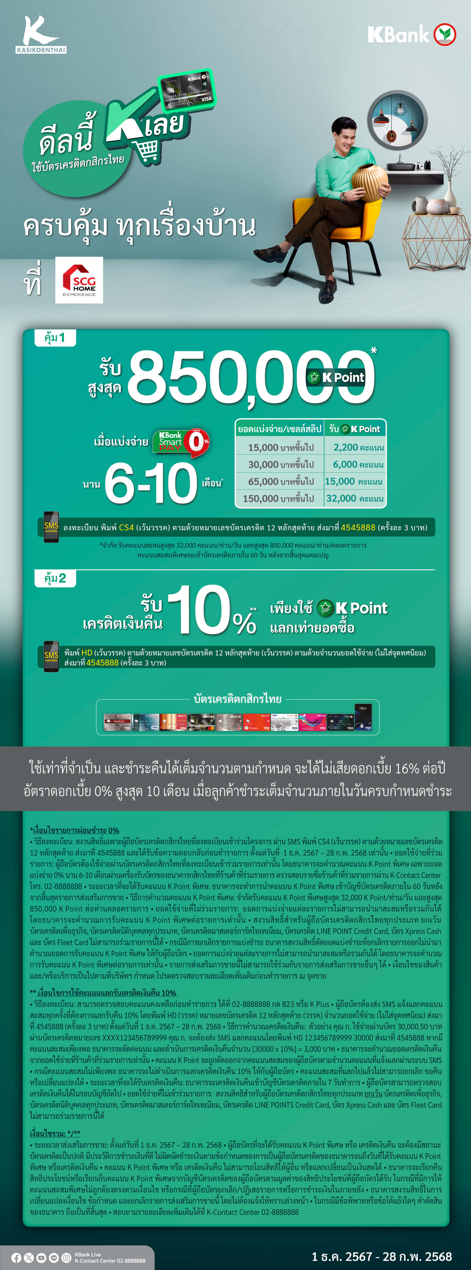 - วิธีลงทะเบียน: สงวนสิทธิ์เฉพาะผู้ถือบัตรเครดิตกสิกรไทยที่ลงทะเบียนเข้าร่วมโครงการ ผ่าน SMS พิมพ์ CS4 (เว้นวรรค) ตามด้วยหมายเลขบัตรเครดิต 12 หลักสุดท้าย ส่งมาที่ 4545888 และได้รับข้อความตอบกลับก่อนทำรายการ ตั้งแต่วันที่ 1 ธ.ค. 67 - 28 ก.พ. 68 เท่านั้น