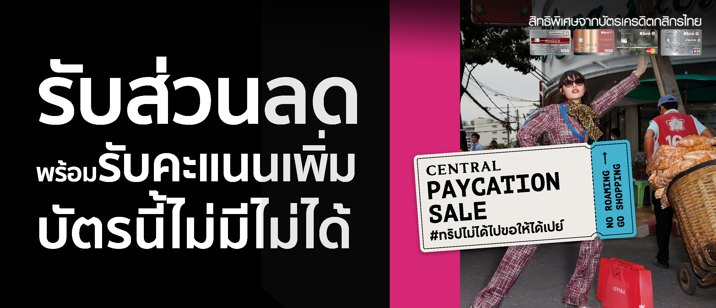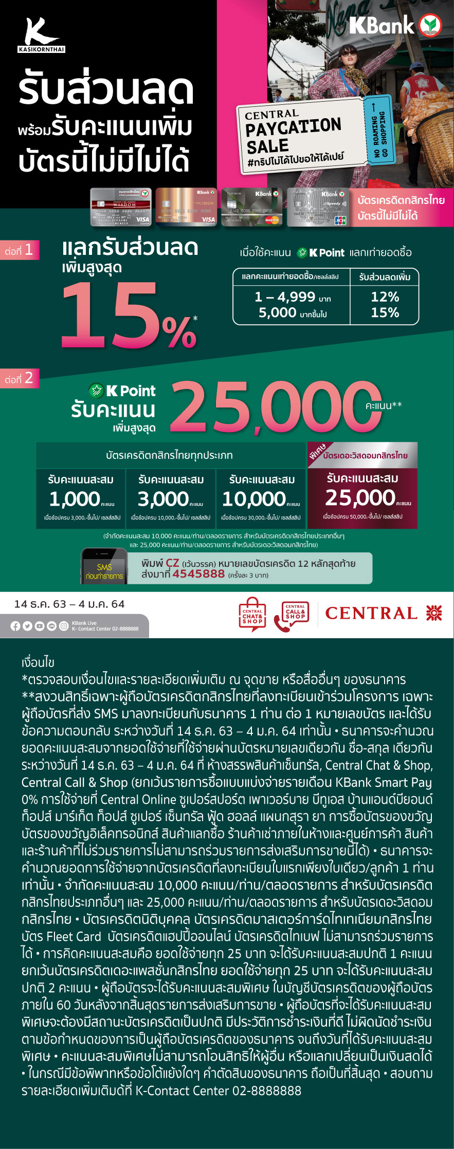 CENTRAL PAYCATION วันนี้ - 04 ม.ค. 64 CENTRAL PAYCATION สิทธิพิเศษสำหรับบัตรเครดิตกสิกรไทย CENTRAL PAYCATION ที่ ห้างสรรพสินค้าเซ็นทรัล ทุกสาขา, Central Chat & Shop, Central Call & Shop ต่อที่ 1 แลกรับส่วนลดเพิ่มสูงสุด 15%* เพียงใช้คะแนนสะสมเท่ายอดซื้อ/เซลส์สลิป แลกคะแนนเท่ายอดซื้อ/เซลส์สลิปรับส่วนลดเพิ่ม1 – 4,99912%5,000 บาทขึ้นไป15% ต่อที่ 2 รับคะแนนสะสมเพิ่มสูงสุด 25,000 คะแนน** เมื่อช้อปครบ 3,000 บาทขึ้นไป/เซลส์สลิป รับคะแนนสะสม 1,000 คะแนน เมื่อช้อปครบ 10,000 บาทขึ้นไป/เซลส์สลิป รับคะแนนสะสม 3,000 คะแนน เมื่อช้อปครบ 30,000 บาทขึ้นไป/เซลส์สลิป รับคะแนนสะสม 10,000 คะแนน พิเศษ เฉพาะบัตรเดอะวิสดอมกสิกรไทย เมื่อช้อปครบ 50,000 บาทขึ้นไป/เซลส์สลิป รับคะแนนสะสม 25,000 คะแนน (จำกัดคะแนนสะสม 10,000 คะแนน/ท่าน/ตลอดรายการ สำหรับบัตรเครดิตกสิกรไทยประเภทอื่นๆ และ 25,000 คะแนน/ท่าน/ตลอดรายการ สำหรับบัตรเดอะวิสดอมกสิกรไทย) SMS ลงทะเบียนพิมพ์ CZ (วรรค) ตามด้วยหมายเลขบัตรเครดิต 12 หลักสุดท้ายส่งมาที่ 4545888 ตัวอย่าง CZ 123456789101 วันที่ 14 ธ.ค. 63 – 4 ม.ค. 64 รายละเอียดเพิ่มเติม คลิก เงื่อนไข *ตรวจสอบเงื่อนไขและรายละเอียดเพิ่มเติม ณ จุดขาย หรือสื่ออื่นๆ ของธนาคาร **สงวนสิทธิ์เฉพาะผู้ถือบัตรเครดิตกสิกรไทยที่ลงทะเบียนเข้าร่วมโครงการ เฉพาะผู้ถือบัตรที่ส่ง SMS มาลงทะเบียนกับธนาคาร 1 ท่าน ต่อ 1 หมายเลขบัตร และได้รับข้อความตอบกลับ ระหว่างวันที่ 14 ธ.ค. 63 – 4 ม.ค. 64 เท่านั้น ธนาคารจะคำนวณยอดคะแนนสะสมจากยอดใช้จ่ายที่ใช้จ่ายผ่านบัตรหมายเลขเดียวกัน ชื่อ -สกุล เดียวกัน ระหว่างวันที่ 14 ธ.ค. 63 – 4 ม.ค. 64 ที่ ห้างสรรพสินค้าเซ็นทรัล, Central Chat & Shop, Central Call & Shop (ยกเว้นรายการซื้อแบบแบ่งจ่ายรายเดือน KBank Smart Pay 0% การใช้จ่ายที่ Central Online ซูเปอร์สปอร์ต เพาเวอร์บาย บีทูเอส บ้านแอนด์บียอนด์ ท็อปส์ มาร์เก็ต ท็อปส์ ซูเปอร์ เซ็นทรัล ฟู้ด ฮอลล์ แผนกสุรา ยา การซื้อบัตรของขวัญ บัตรของขวัญอิเล็คทรอนิกส์ สินค้าแลกซื้อ ร้านค้าเช่าภายในห้างและศูนย์การค้า สินค้าและร้านค้าที่ไม่ร่วมรายการไม่สามารถร่วมรายการส่งเสริมการขายนี้ได้) ธนาคารจะคำนวณยอดการใช้จ่ายจากบัตรเครดิตที่ลงทะเบียนใบแรกเพียงใบเดียว/ลูกค้า 1 ท่านเท่านั้น จำกัดคะแนนสะสม 10,000 คะแนน/ท่าน/ตลอดรายการ สำหรับบัตรเครดิตกสิกรไทยประเภทอื่นๆ และ 25,000 คะแนน/ท่าน/ตลอดรายการ สำหรับบัตรเดอะวิสดอมกสิกรไทย บัตรเครดิตนิติบุคคล บัตรเครดิตมาสเตอร์การ์ดไทเทเนียมกสิกรไทย บัตร Fleet Card บัตรเครดิตแฮปปี้ออนไลน์ บัตรเครดิตไทเบฟ ไม่สามารถร่วมรายการได้ การคิดคะแนนสะสมคือ ยอดใช้จ่ายทุก 25 บาท จะได้รับคะแนนสะสมปกติ 1 คะแนน ยกเว้นบัตรเครดิตเดอะแพสชั่นกสิกรไทย ยอดใช้จ่ายทุก 25 บาท จะได้รับคะแนนสะสมปกติ 2 ค