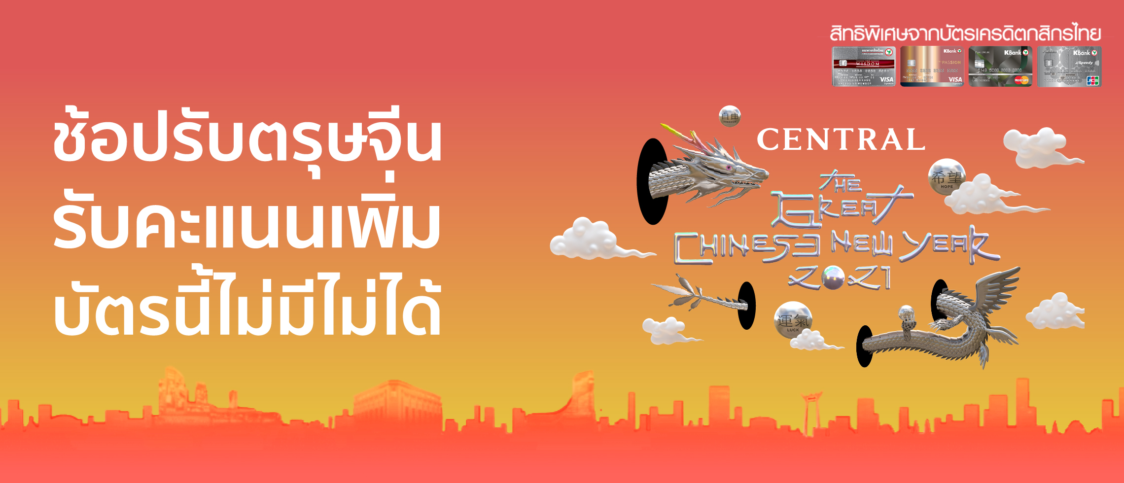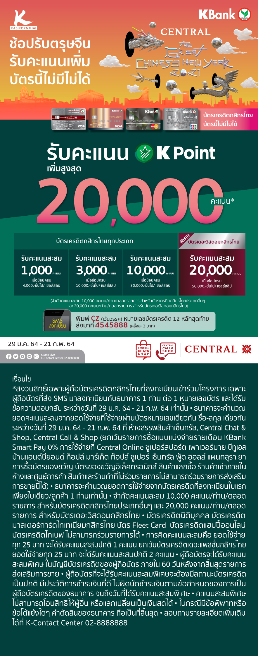 CENTRAL THE GREAT CHINESE NEW YEAR 2021 29 ม.ค. 64 - 21 ก.พ. 64 CENTRAL THE GREAT CHINESE NEW YEAR 2021 สิทธิพิเศษสำหรับบัตรเครดิตกสิกรไทยที่ ห้างสรรพสินค้าเซ็นทรัล ทุกสาขา, Central Chat & Shop, Central Call & Shop รับคะแนน K Point เพิ่มสูงสุด 20,000 คะแนน เมื่อช้อปครบ 4,000 บาทขึ้นไป/เซลส์สลิป รับคะแนนสะสม 1,000 คะแนน เมื่อช้อปครบ 10,000 บาทขึ้นไป/เซลส์สลิป รับคะแนนสะสม 3,000 คะแนน เมื่อช้อปครบ 30,000 บาทขึ้นไป/เซลส์สลิป รับคะแนนสะสม 10,000 คะแนน พิเศษ เฉพาะบัตรเดอะวิสดอมกสิกรไทย เมื่อช้อปครบ 50,000 บาทขึ้นไป/เซลส์สลิป รับคะแนนสะสม 20,000 คะแนน (จำกัดคะแนนสะสม 10,000 คะแนน/ท่าน/ตลอดรายการ สำหรับบัตรเครดิตกสิกรไทยประเภทอื่นๆ และ 20,000 คะแนน/ท่าน/ตลอดรายการ สำหรับบัตรเดอะวิสดอมกสิกรไทย) SMS ลงทะเบียนพิมพ์ CZ (วรรค) ตามด้วยหมายเลขบัตรเครดิต 12 หลักสุดท้ายส่งมาที่ 4545888 ตัวอย่าง CZ 123456789101 วันที่ 29 ม.ค. 64 - 21 ก.พ. 64 รายละเอียดเพิ่มเติม คลิก โปรดีขนาดนี้..มีบัตรเครดิตกสิกรไทยหรือยัง? คลิกสมัครเลย! เงื่อนไขสงวนสิทธิ์เฉพาะผู้ถือบัตรเครดิตกสิกรไทยที่ลงทะเบียนเข้าร่วมโครงการ เฉพาะผู้ถือบัตรที่ส่ง SMS มาลงทะเบียนกับธนาคาร 1 ท่าน ต่อ 1 หมายเลขบัตร และได้รับข้อความตอบกลับ ระหว่างวันที่ 29 ม.ค. 64 - 21 ก.พ. 64 เท่านั้นธนาคารจะคำนวณยอดคะแนนสะสมจากยอดใช้จ่ายที่ใช้จ่ายผ่านบัตรหมายเลขเดียวกัน ชื่อ -สกุล เดียวกัน ระหว่างวันที่ 29 ม.ค. 64 - 21 ก.พ. 64 ที่ ห้างสรรพสินค้าเซ็นทรัล, Central Chat & Shop, Central Call & Shop (ยกเว้นรายการซื้อแบบแบ่งจ่ายรายเดือน KBank Smart Pay 0% การใช้จ่ายที่ Central Online ซูเปอร์สปอร์ต เพาเวอร์บาย บีทูเอส บ้านแอนด์บียอนด์ ท็อปส์ มาร์เก็ต ท็อปส์ ซูเปอร์ เซ็นทรัล ฟู้ด ฮอลล์ แผนกสุรา ยา การซื้อบัตรของขวัญ บัตรของขวัญอิเล็คทรอนิกส์ สินค้าแลกซื้อ ร้านค้าเช่าภายในห้างและศูนย์การค้า สินค้าและร้านค้าที่ไม่ร่วมรายการไม่สามารถร่วมรายการส่งเสริมการขายนี้ได้) ธนาคารจะคำนวณยอดการใช้จ่ายจากบัตรเครดิตที่ลงทะเบียนใบแรกเพียงใบเดียว/ลูกค้า 1 ท่านเท่านั้น จำกัดคะแนนสะสม 10,000 คะแนน/ท่าน/ตลอดรายการ สำหรับบัตรเครดิตกสิกรไทยประเภทอื่นๆ และ 20,000 คะแนน/ท่าน/ตลอดรายการ สำหรับบัตรเดอะวิสดอมกสิกรไทย บัตรเครดิตนิติบุคคล บัตรเครดิตมาสเตอร์การ์ดไทเทเนียมกสิกรไทย บัตร Fleet Card บัตรเครดิตแฮปปี้ออนไลน์ บัตรเครดิตไทเบฟ ไม่สามารถร่วมรายการได้ การคิดคะแนนสะสมคือ ยอดใช้จ่ายทุก 25 บาท จะได้รับคะแนนสะสมปกติ 1 คะแนน ยกเว้นบัตรเครดิตเดอะแพสชั่นกสิกรไทย ยอดใช้จ่ายทุก 25 บาท จะได้รับคะแนนสะสมปกติ 2 คะแนน ผู้ถือบัตรจะได้รับคะแนนสะสมพิเศษ ในบัญชีบัตรเครดิตของผู้ถือบัตร ภายใน 60 วันหลังจากสิ้นสุดรายการส่งเสริมการขาย ผู้ถือบัตรที่จะได้รับคะแนนสะสมพิเศษจะ