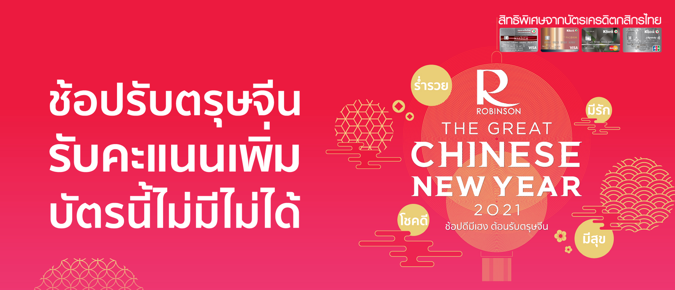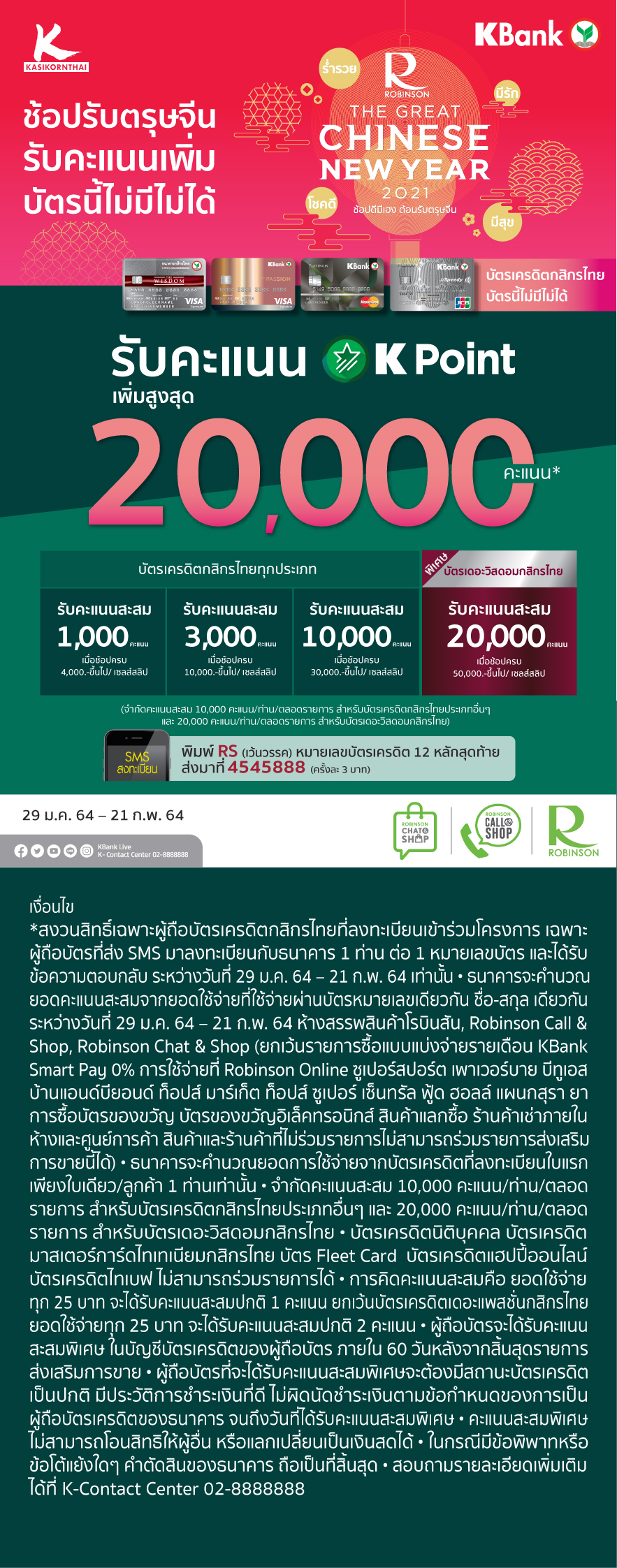 ROBINSON THE GREAT CHINESE NEW YEAR 2021 29 ม.ค. 64 - 21 ก.พ. 64 ROBINSON THE GREAT CHINESE NEW YEAR 2021 สิทธิพิเศษสำหรับบัตรเครดิตกสิกรไทย รับคะแนนสะสม K Point เพิ่มสูงสุด 20,000 คะแนน เมื่อช้อปครบ 4,000 บาทขึ้นไป/เซลส์สลิป รับคะแนนสะสม 1,000 คะแนน เมื่อช้อปครบ 10,000 บาทขึ้นไป/เซลส์สลิป รับคะแนนสะสม 3,000 คะแนน เมื่อช้อปครบ 30,000 บาทขึ้นไป/เซลส์สลิป รับคะแนนสะสม 10,000 คะแนน พิเศษ เฉพาะบัตรเดอะวิสดอมกสิกรไทย เมื่อช้อปครบ 50,000 บาทขึ้นไป/เซลส์สลิป รับคะแนนสะสม 20,000 คะแนน (จำกัดคะแนนสะสม 10,000 คะแนน/ท่าน/ตลอดรายการ สำหรับบัตรเครดิตกสิกรไทยประเภทอื่นๆ และ 20,000 คะแนน/ท่าน/ตลอดรายการ สำหรับบัตรเดอะวิสดอมกสิกรไทย) SMS ลงทะเบียนพิมพ์ RS (วรรค) ตามด้วยหมายเลขบัตรเครดิต 12 หลักสุดท้ายส่งมาที่ 4545888 ตัวอย่าง RS 123456789101 วันที่ 29 ม.ค. 64 – 21 ก.พ. 64 รายละเอียดเพิ่มเติม คลิก โปรดีขนาดนี้..มีบัตรเครดิตกสิกรไทยหรือยัง? คลิกสมัครเลย! เงื่อนไขสงวนสิทธิ์ในการมอบคะแนนสะสมเฉพาะผู้ถือบัตรที่ส่ง SMS มาลงทะเบียนกับธนาคาร 1 ท่าน ต่อ 1 หมายเลขบัตร และได้รับข้อความตอบกลับ ระหว่างวันที่ 29 ม.ค. 64 – 21 ก.พ. 64 เท่านั้น ธนาคารจะคำนวณยอดคะแนนสะสมจากยอดใช้จ่ายที่ใช้จ่ายผ่านบัตรหมายเลขเดียวกัน ชื่อ - สกุล เดียวกัน ระหว่างวันที่ 29 ม.ค. 64 – 21 ก.พ. 64 ที่ ห้างสรรพสินค้าโรบินสัน, Robinson Call & Shop, Robinson Chat & Shop (ยกเว้นรายการซื้อแบบแบ่งจ่ายรายเดือน KBank Smart Pay 0% การใช้จ่ายที่ Robinson Online ซูเปอร์สปอร์ต เพาเวอร์บาย บีทูเอส บ้านแอนด์บียอนด์ ท็อปส์ มาร์เก็ต ท็อปส์ ซูเปอร์ เซ็นทรัล ฟู้ด ฮอลล์ แผนกสุรา ยา การซื้อบัตรของขวัญ บัตรของขวัญอิเล็คทรอนิกส์ สินค้าแลกซื้อ ร้านค้าเช่าภายในห้างและศูนย์การค้า สินค้าและร้านค้าที่ไม่ร่วมรายการไม่สามารถร่วมรายการส่งเสริมการขายนี้ได้)ธนาคารจะคำนวณยอดการใช้จ่ายจากบัตรเครดิตที่ลงทะเบียนใบแรกเพียงใบเดียว/ลูกค้า 1 ท่านเท่านั้นจำกัดคะแนนสะสม 10,000 คะแนน/ท่าน/ตลอดรายการ สำหรับบัตรเครดิตกสิกรไทยประเภทอื่นๆ และ 20,000 คะแนน/ท่าน/ตลอดรายการ สำหรับบัตรเดอะวิสดอมกสิกรไทย บัตรเครดิตนิติบุคคล บัตรเครดิตมาสเตอร์การ์ดไทเทเนียมกสิกรไทย บัตร Fleet Card บัตรเครดิตแฮปปี้ออนไลน์ บัตรเครดิตไทเบฟ ไม่สามารถร่วมรายการได้ การคิดคะแนนสะสมคือ ยอดใช้จ่ายทุก 25 บาท จะได้รับคะแนนสะสมปกติ 1 คะแนน ยกเว้นบัตรเครดิตเดอะแพสชั่นกสิกรไทย ยอดใช้จ่ายทุก 25 บาท จะได้รับคะแนนสะสมปกติ 2 คะแนน ผู้ถือบัตรจะได้รับคะแนนสะสมพิเศษ ในบัญชีบัตรเครดิตของผู้ถือบัตร ภายใน 60 วันหลังจากสิ้นสุดรายการส่งเสริมการขาย ผู้ถือบัตรที่จะได้รับคะแนนสะสมพิเศษจะต้องมีสถานะบัตรเครดิตเป็นปกติ มีประวัติการชำระเงินที่ดี ไม่ผิดนัดชำระเงินตามข้อก