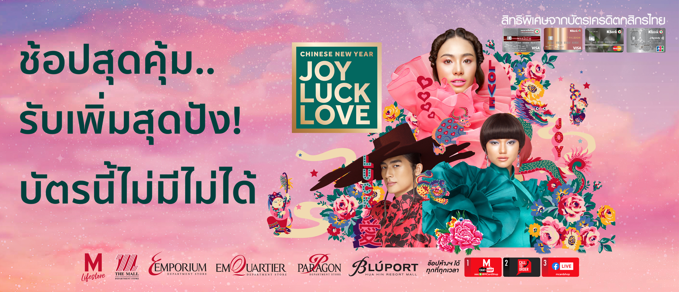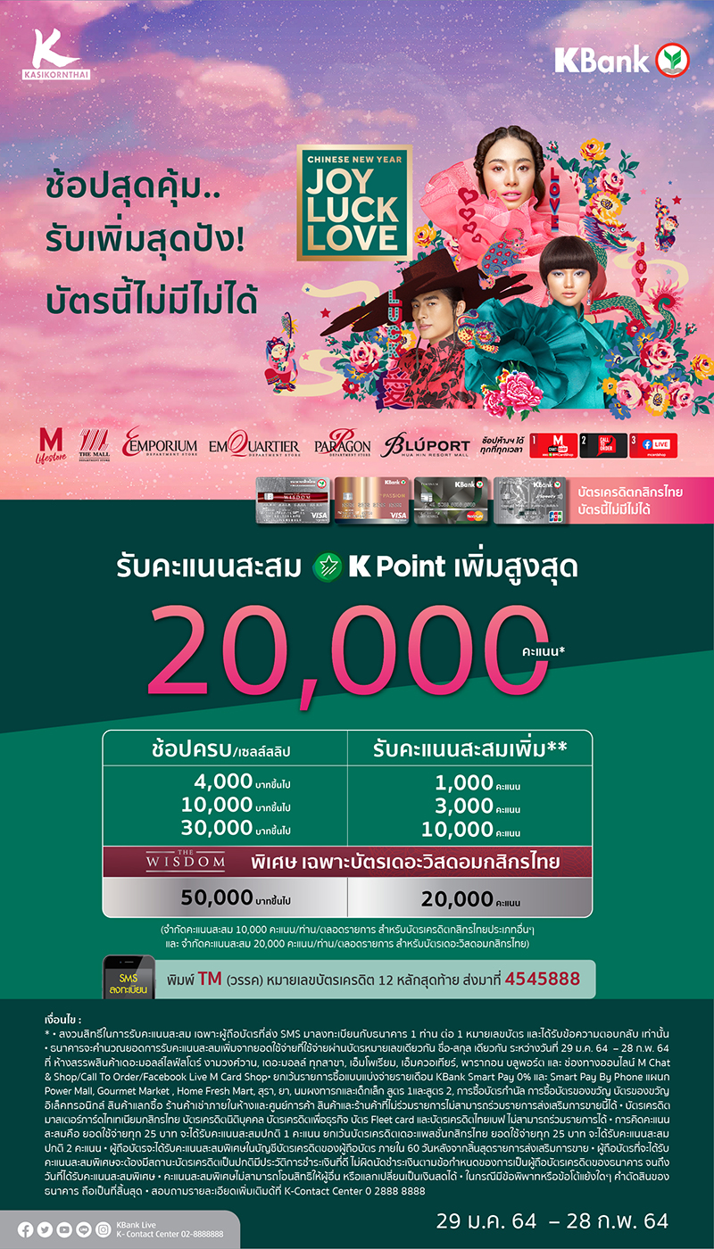 The Mall JOY LUCK LOVE ที่ ห้างสรรพสินค้าเดอะมอลล์ ทุกสาขา วันนี้ - 28 ก.พ. 64 The Mall JOY LUCK LOVE ที่ ห้างสรรพสินค้าเดอะมอลล์ ทุกสาขา, เอ็มโพเรียม, เอ็มควอเทียร์, พารากอน และ บลูพอร์ต ช้อปด้วยบัตรเครดิตกสิกรไทย รับคะแนนสะสม K Point เพิ่มสูงสุด 20,000 คะแนน* ช้อปครบ/เซลส์สลิปรับคะแนนสะสมเพิ่ม**4,000 บาทขึ้นไป1,000 คะแนน10,000 บาทขึ้นไป3,000 คะแนน30,000 บาทขึ้นไป10,000 คะแนนพิเศษ เฉพาะบัตรเดอะวิสดอมกสิกรไทย 50,000 บาทขึ้นไป20,000 คะแนน (จำกัดคะแนนสะสม 10,000 คะแนน/ท่าน/ตลอดรายการ สำหรับบัตรเครดิตกสิกรไทยประเภทอื่นๆ และ จำกัดคะแนนสะสม 20,000 คะแนน/ท่าน/ตลอดรายการ สำหรับบัตรเดอะวิสดอมกสิกรไทย) ที่ ห้างสรรพสินค้าเดอะมอลล์ ทุกสาขา, เอ็มโพเรียม, เอ็มควอเทียร์, พารากอน และ บลูพอร์ต ลงทะเบียนรับเครดิตเงินคืนพิมพ์ TM (วรรค) ตามด้วยหมายเลขบัตรเครดิต 12 หลักสุดท้ายส่งมาที่ 4545888 วันที่ 29 ม.ค. 64 – 28 ก.พ. 64 รายละเอียดเพิ่มเติม คลิก โปรดีขนาดนี้..มีบัตรเครดิตกสิกรไทยหรือยัง? คลิกสมัครเลย! เงื่อนไข *สงวนสิทธิ์ในการรับคะแนนสะสม เฉพาะผู้ถือบัตรที่ส่ง SMS มาลงทะเบียนกับธนาคาร 1 ท่าน ต่อ 1 หมายเลขบัตร และได้รับข้อความตอบกลับ เท่านั้น ธนาคารจะคำนวณยอดการรับคะแนนสะสมเพิ่มจากยอดใช้จ่ายที่ใช้จ่ายผ่านบัตรหมายเลขเดียวกัน ชื่อ -สกุล เดียวกัน ระหว่างวันที่ 29 ม.ค. 64 – 28 ก.พ. 64 ที่ ห้างสรรพสินค้าเดอะมอลล์ ทุกสาขา, เอ็มโพเรียม, เอ็มควอเทียร์, พารากอน บลูพอร์ต และ ช่องทาง M Chat & Shop/ www.mcardshop.com ยกเว้นรายการซื้อแบบแบ่งจ่ายรายเดือน KBank Smart Pay 0% และ Smart Pay By Phone แผนก Power Mall , Gourmet Market , Home Fresh Mart ,สุรา, ยา, นมผงทารกและเด็กเล็ก สูตร 1และสูตร 2 ,การซื้อบัตรกำนัล การซื้อบัตรของขวัญ บัตรของขวัญอิเล็คทรอนิกส์ สินค้าแลกซื้อ ร้านค้าเช่าภายในห้างและศูนย์การค้า สินค้าและร้านค้าที่ไม่ร่วมรายการไม่สามารถร่วมรายการส่งเสริมการขายนี้ได้ บัตรเครดิตมาสเตอร์การ์ดไทเทเนียมกสิกรไทย บัตรเครดิตนิติบุคคล บัตรเครดิตเพื่อธุรกิจ บัตร Fleet card และบัตรเครดิตไทยเบฟ ไม่สามารถร่วมรายการได้ การคิดคะแนนสะสมคือ ยอดใช้จ่ายทุก 25 บาท จะได้รับคะแนนสะสมปกติ 1 คะแนน ยกเว้นบัตรเครดิตเดอะแพสชั่นกสิกรไทย ยอดใช้จ่ายทุก 25 บาท จะได้รับคะแนนสะสมปกติ 2 คะแนน ผู้ถือบัตรจะได้รับคะแนนสะสมพิเศษ ในบัญชีบัตรเครดิตของผู้ถือบัตร ภายใน 60 วันหลังจากสิ้นสุดรายการส่งเสริมการขาย ผู้ถือบัตรที่จะได้รับคะแนนสะสมพิเศษจะต้องมีสถานะบัตรเครดิตเป็นปกติ มีประวัติการชำระเงินที่ดี ไม่ผิดนัดชำระเงินตามข้อกำหนดของการเป็นผู้ถือบัตรเครดิตของธนาคาร จนถึงวันที่ได้รับคะแนนสะสมพิเศษ คะแนนสะสมพิเศษไม่สามารถโอนสิทธิให้ผู้อื่น หรือแลกเปล