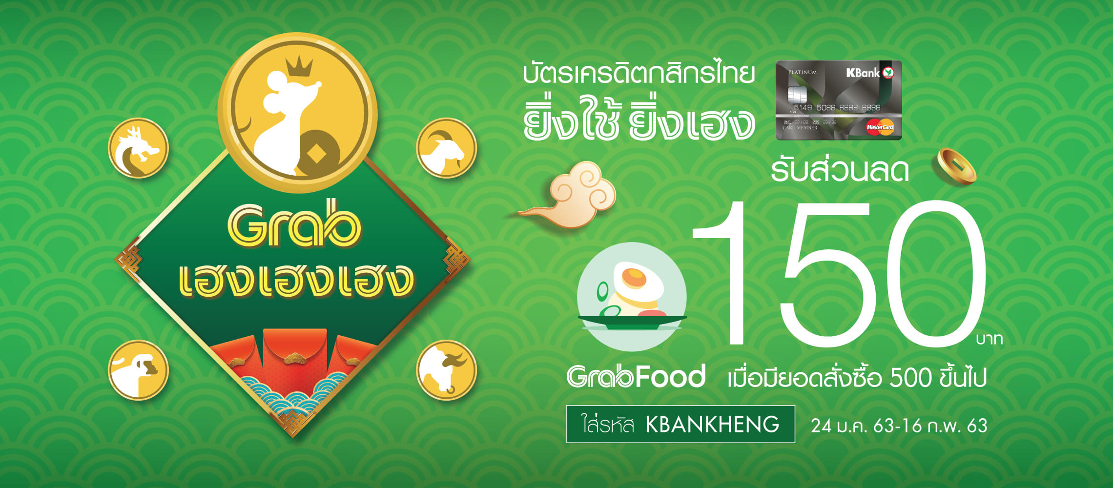 วันนี้ - 29 ก.พ. 2563 ยิ่งใช้ยิ่งเฮง บัตรเครดิตกสิกรไทยรับส่วนลด GrabFood 150 บาท เงื่อนไขและข้อกำหนดผู้ถือบัตรเครดิตกสิกรไทย รับส่วนลดค่าอาหารมูลค่า 150 บาท เมื่อมียอดสั่งขั้นต่ำ 500 บาท ใส่รหัส KBANKHENG (จำกัดสิทธิ์ 1 สิทธิ์ / ผู้ใช้ /1 รายการสั่งซื้อ) และจำกัดสิทธิ์สูงสุด 5 สิทธิ์ / ผู้ใช้/ ตลอดระยะเวลารายการส่งเสริมการขายผู้ใช้จะต้องกรอกรหัสส่วนลดที่ได้รับในช่องกรอกรหัสส่วนลดที่ได้รับและเลือก GrabPay เป็นวิธีการชำระเงิน โดยเลือกบัตรเครดิตกสิกรไทยก่อนที่จะทำการสั่งอาหาร เท่านั้นสามารถใช้ได้กับบริการ GrabFood ในประเทศไทย เท่านั้นรหัสส่วนลดสามารถใช้งานได้ทั้งวัน (เวลา 00:00 ถึง 23:59) ของวันที่ 24 ม.ค. 2563 ถึง 29 ก.พ. 2563ไม่สามารถใช้โปรโมชั่นนี้ร่วมกับโปรโมชั่นอื่นๆ ของ Grab ได้ผู้ใช้บริการตกลงเป็นผู้ชำระค่าส่งและค่าบริการส่วนต่างหลังจากหักส่วนลดตามที่ได้รับแล้ว หากส่วนลดที่ผู้ใช้บริการได้รับมากกว่าค่าบริการในแต่ละครั้ง ผู้ใช้บริการตกลงยอมรับว่า ส่วนต่างจากส่วนลดดังกล่าวไม่สามารถแลกเปลี่ยนเป็นเงินสด หรือนำไปเป็นส่วนลดในการใช้บริการครั้งถัดไปได้Grab ขอสงวนสิทธิ์ในการเปลี่ยนแปลงเงื่อนไขรายการส่งเสริมการขายโดยไม่ต้องแจ้งให้ทราบล่วงหน้า และในกรณีที่มีข้อพิพาท คำตัดสินของบริษัทถือเป็นที่สิ้นสุดข้อมูลเพิ่มเติม กรุณาติดต่อ Grab Call Center 02 021 2525 ดาวน์โหลดแอปพลิเคชัน Grab ได้ที่ บัตรเครดิต ร้านอาหารไลฟ์สไตล์โอน-เติม-จ่าย