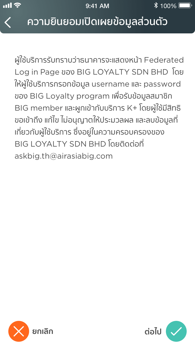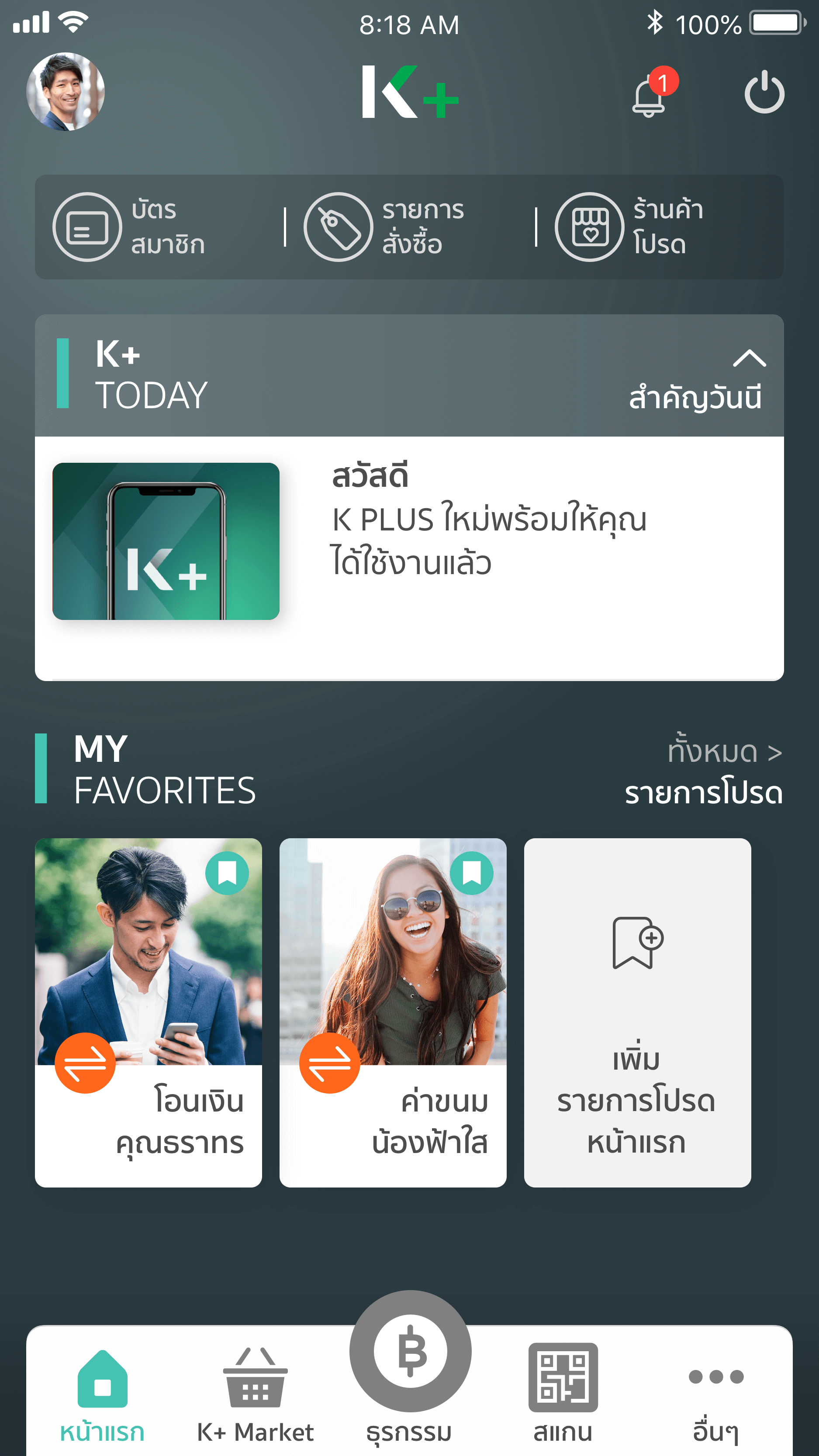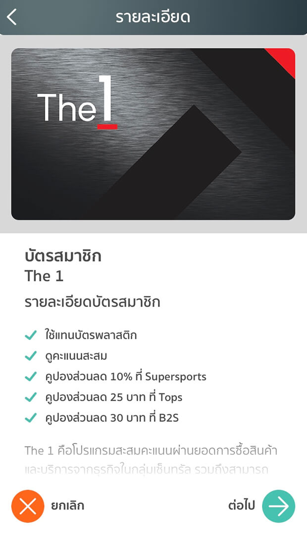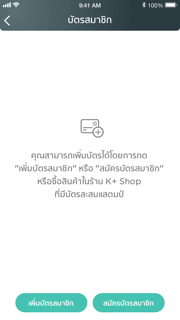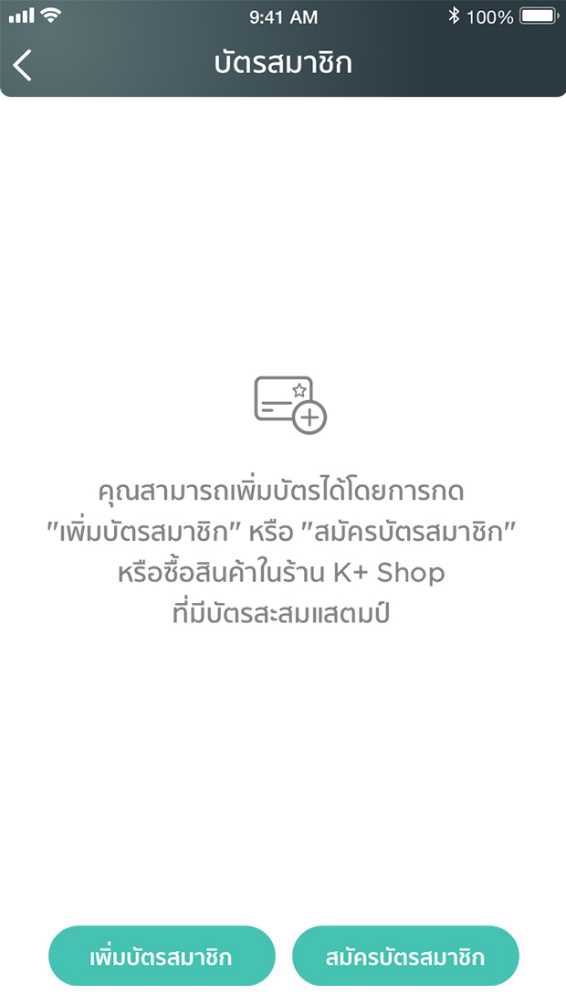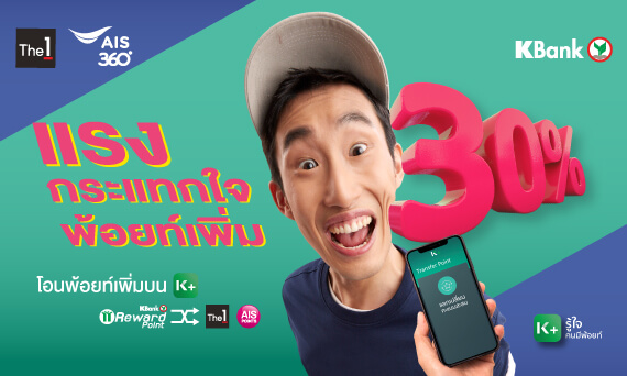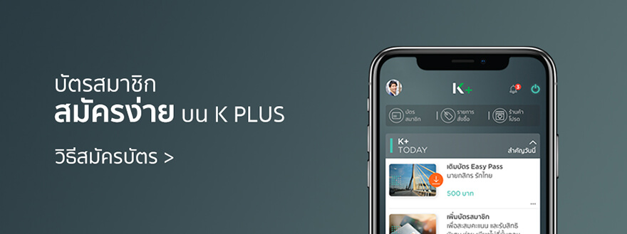 แนะนำผลิตภัณฑ์ เพิ่มหรือสมัครบัตรบน K PLUS รับโปรฯ แรงจากพันธมิตรชั้นนำ จัดการบัตรสมาชิกทุกใบที่มีได้ง่ายกว่า เพียงแค่กดเพิ่มบัตรสมาชิกหรือสมัครบัตรสมาชิกใหม่บนแอป K PLUS ก็รับทั้งคะแนนสะสมและส่วนลดพิเศษไปแบบง่าย ๆ 21 ม.ค. 62 - 31 มี.ค. 62 โปรโมชั่นเมื่อเพิ่มบัตรสมาชิก AirAsia BIG สมาชิก AirAsia BIG รับฟรีโบนัส 200 BIG Points เมื่อเพิ่มสมาชิก AirAsia BIG บนแอปพลิเคชัน K PLUS (จำกัด 10,000 สิทธิ์แรก) ดูเงื่อนไข ดูวิธีเพิ่มบัตร 26 พ.ย.61 – 31 ม.ค.62 โปรโมชั่นเมื่อเพิ่มบัตร The 1 รับคะแนนสะสม 50 คะแนน (จำกัด 20,000 สิทธิ์แรก) รับคูปองส่วนลด 30 บาท เมื่อซื้อสินค้าครบ 300 บาทขึ้นไป ที่ร้าน B2S รับคูปองส่วนลด 25 บาท เมื่อซื้อสินค้าครบ 500 บาทขึ้นไป ที่ Tops รับส่วนลด 10% ที่ Supersports เมื่อซื้อสินค้าราคาปกติ ดูเงื่อนไข ดูวิธีเพิ่มบัตร 26 พ.ย.61 – 31 ม.ค.62 โปรโมชั่นเมื่อสมัครบัตร The 1 รับคะแนนสะสม 300 คะแนน รับคูปองส่วนลด 30 บาท เมื่อซื้อสินค้าครบ 300 บาทขึ้นไป ที่ร้าน B2S ทุกสาขา รับคูปองส่วนลด 25 บาท เมื่อซื้อสินค้าครบ 500 บาทขึ้นไป ที่ Tops รับฟรี Specialty Pretzel 1 ชิ้น จากร้าน Auntie Anne’s (จำกัด 2,000 สิทธิ์แรก) ดูเงื่อนไข ดูวิธีสมัครบัตร 26 พ.ย.61 – 28 ก.พ.62 โปรโมชั่นเมื่อเพิ่มบัตร Boots Advantage Card รับคูปองส่วนลด 20 บาท ใช้ได้เมื่อใช้จ่ายในร้าน Boots 500 บาทขึ้นไป / ใบเสร็จ (จำกัด 40,000 สิทธิ์) ดูเงื่อนไข ดูวิธีเพิ่มบัตร สะสมคะแนน PTT Blue Card ได้ง่ายๆเพิ่มบัตร PTT Blue Card ในแอปพลิเคชั่น K PLUS เพื่อสะสมคะแนน เมื่อช้อปสินค้าและบริการที่ร้านค้าในเครือ PTT Station ดูคะแนน AIS Points สะดวกเพียงปลายนิ้ววันนี้ลูกค้า AIS สามารถดูคะแนนสะสม AIS Points ได้ง่ายๆ บนแอปพลิเคชั่น K PLUS เพียงเพิ่ม เมนู AIS Points โปรโมชั่นเมื่อเพิ่มบัตร The 1 บน K PLUSระยะเวลาโปรโมชั่น ตั้งแต่ 26 พ.ย. 61 - 31 ม.ค. 62 เงื่อนไขสงวนสิทธิ์สำหรับลูกค้าที่มีแอปพลิเคชัน K PLUS และเป็นสมาชิก The 1 เท่านั้นสิทธิพิเศษนี้ใช้ได้ระหว่างวันที่ 26 พฤศจิกายน 2561 – 31 มกราคม 2562 เท่านั้นสิทธิพิเศษสำหรับลูกค้าที่มีการเพิ่มบัตรสมาชิก The 1 ลงในแอปพลิเคชัน K PLUS ในส่วนของบัตรสมาชิกสำเร็จเท่านั้นคะแนนสะสมพิเศษ 50 คะแนน จำกัดสิทธิ์สำหรับลูกค้า 20,000 ท่านแรก โดยคะแนนจะเข้าระบบ The 1 ของท่านภายในวันเดียวกันกับที่มีการเพิ่มบัตร The1 บนแอปพลิเคชัน K PLUSรับทันที e-coupon ส่วนลดจาก B2S*, Tops Supermarket** และ Supersports***สงวนสิทธิ์ลูกค้า 1 ท่าน / สิทธิ์ / ตลอดรายการสงวนสิทธิ์ลูกค้าที่ทำการลบบัตรสมาชิก The 1 ออกจากแอปพลิเคชัน K PLUS และทำการเพิ่มบัตรเข้าไปใหม่ จะไม่สามารถได้รับสิทธิพิเศษนี้สอบถามข้อมูลเพิ่มเติมเกี่ยวกับวิธีการใช้งานแอปพลิเคชัน K PLUS ได้ที่ K Contact Center โทร.02-888-8888 กด 03สอบถามข้อมูลเพิ่มเติมเกี่ยวกับเรื่องบัตร The 1 ได้ที่ The1 Contact Center โทร. 02-660-1000ธนาคารขอสงวนสิทธิ์ในการแก้