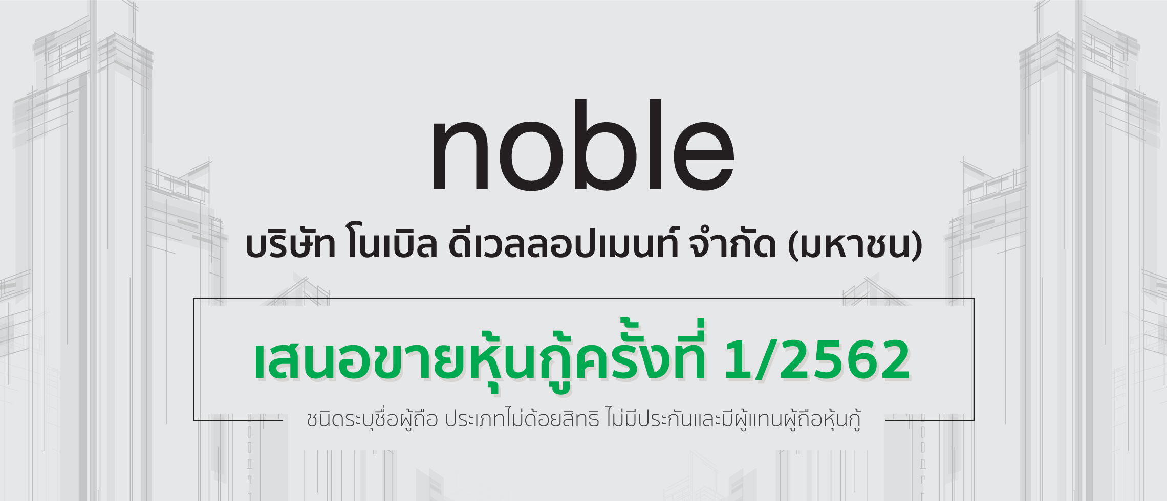 วันนี้ - 19 มิ.ย. 2562 เสนอขายหุ้นกู้ บริษัท โนเบิล ดีเวลลอปเมนท์ จำกัด (มหาชน) บริษัท โนเบิล ดีเวลลอปเมนท์ จำกัด (มหาชน) เสนอขายหุ้นกู้ครั้งที่ 1/2562 ชนิดระบุชื่อผู้ถือ ประเภทไม่ด้อยสิทธิ ไม่มีประกัน และมีผู้แทนผู้ถือหุ้นกู้ หุ้นกู้อายุ 3 ปีอัตราดอกเบี้ยคงที่ [4.50]% ต่อปีชำระดอกเบี้ยทุกๆ 3 เดือน อันดับความน่าเชื่อถือของบริษัทที่ระดับ “BBB” แนวโน้ม “ลบ”โดยบริษัท ทริสเรทติ้ง จำกัด เมื่อวันที่ 1 มีนาคม 2562จองซื้อขั้นต่ำ 100,000 บาท และทวีคูณครั้งละ 100,000 บาท เสนอขายให้ผู้ลงทุนสถาบันและ/หรือผู้ลงทุนรายใหญ่ทั้งนี้การจัดสรรหุ้นกู้ให้เป็นดุยลพินิจของผู้จัดการการจัดจำหน่ายหุ้นกู้เปิดจองซื้อและขอรับหนังสือชี้ชวนระหว่างวันที่ 17 - 19 มิถุนายน 2562 สอบถามข้อมูลเพิ่มเติมได้ที่ ธนาคารกสิกรไทย โทร. 02-8888888 กด 819 ผู้ลงทุนสามารถศึกษารายละเอียดได้จากแบบแสดงรายการข้อมูลและร่างหนังสือชี้ชวนที่ www.sec.or.th คำเตือน: “ทำความเข้าใจลักษณะสินค้า เงื่อนไขผลตอบแทน และความเสี่ยงก่อนตัดสินใจลงทุน” หมายเหตุ: แบบแสดงรายการข้อมูลการเสนอขายหลักทรัพย์และร่างหนังสือชี้ชวน ยังไม่มีผลบังคับใช้เนื่องจากอยู่ระหว่างยื่นขอพิจารณาของสำนักงาน ก.ล.ต. ลงทุน ลงทุน