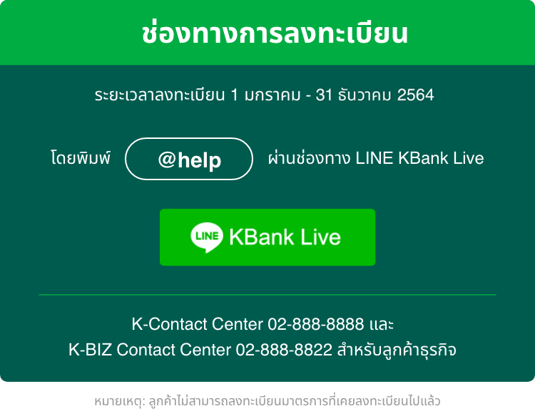 ลูกค้าสามารถลงทะเบียน พิมพ์ @help ผ่านช่องทาง LINE KBank Live หรือ K-Contact Center 02-8888888 หรือ K-Biz Contact Center 02-8888822