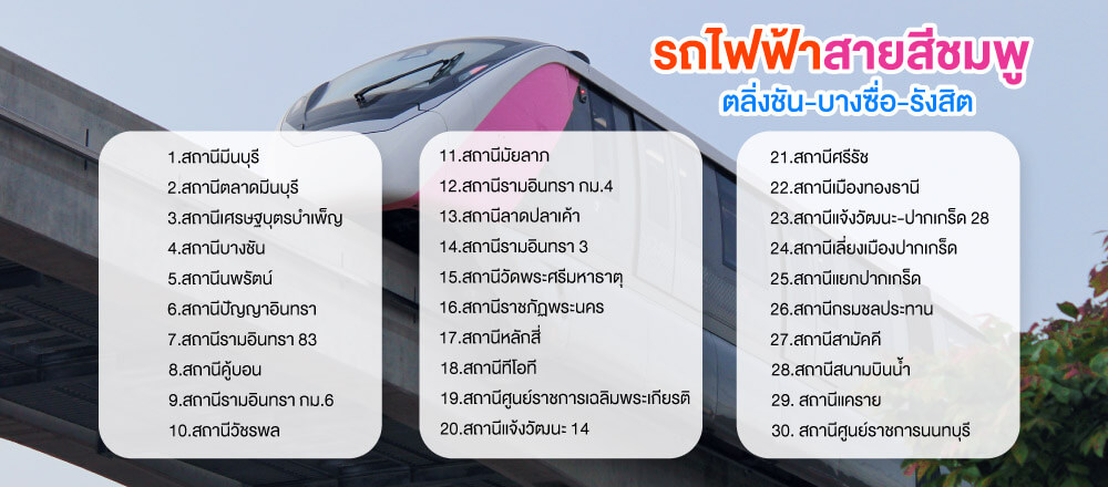 สำหรับโครงการรถไฟฟ้าสายสีชมพู (มีนบุรี - แคราย) ดำเนินการโดยการรถไฟฟ้าขนส่งมวลชนแห่งประเทศไทย (รฟม.) โดยมีทั้งหมด 30 สถานี ระยะทาง 34.5 กิโลเมตร ซึ่งเป็นรูปแบบเป็นรถไฟฟ้าโมโนเรลที่ลอยฟ้าตลอดสาย