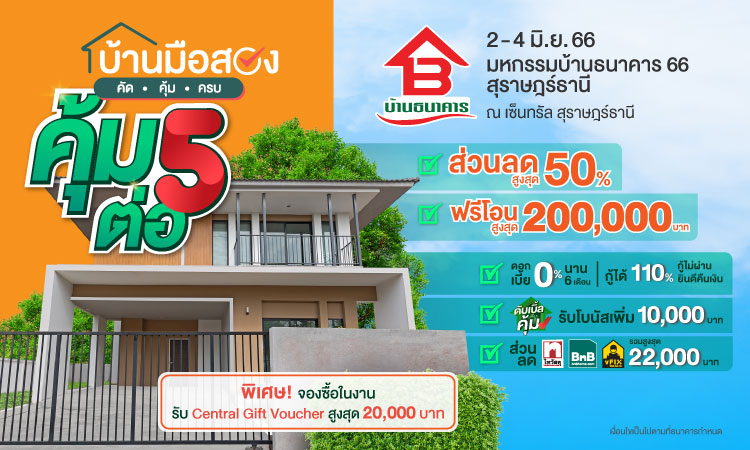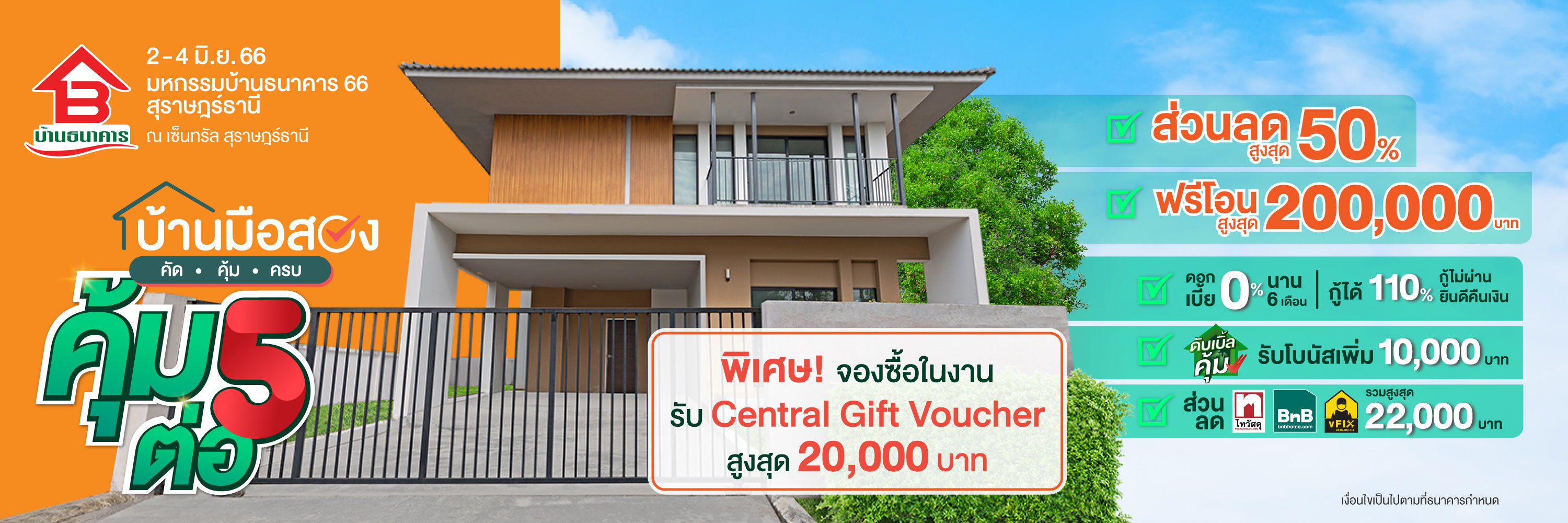 - เงื่อนไขพิเศษ เฉพาะลูกค้าที่เสนอซื้อทรัพย์สินรอการขายในงาน มหกรรมบ้านธนาคาร 66 ตั้งแต่วันที่ 24 พฤษภาคม - 4 มิถุนายน 2566 เท่านั้น โดยผู้ซื้อต้องระบุโค้ด “EXPOSR23” ในช่อง โค้ดโปรโมชัน ที่หน้าการเสนอซื้อ