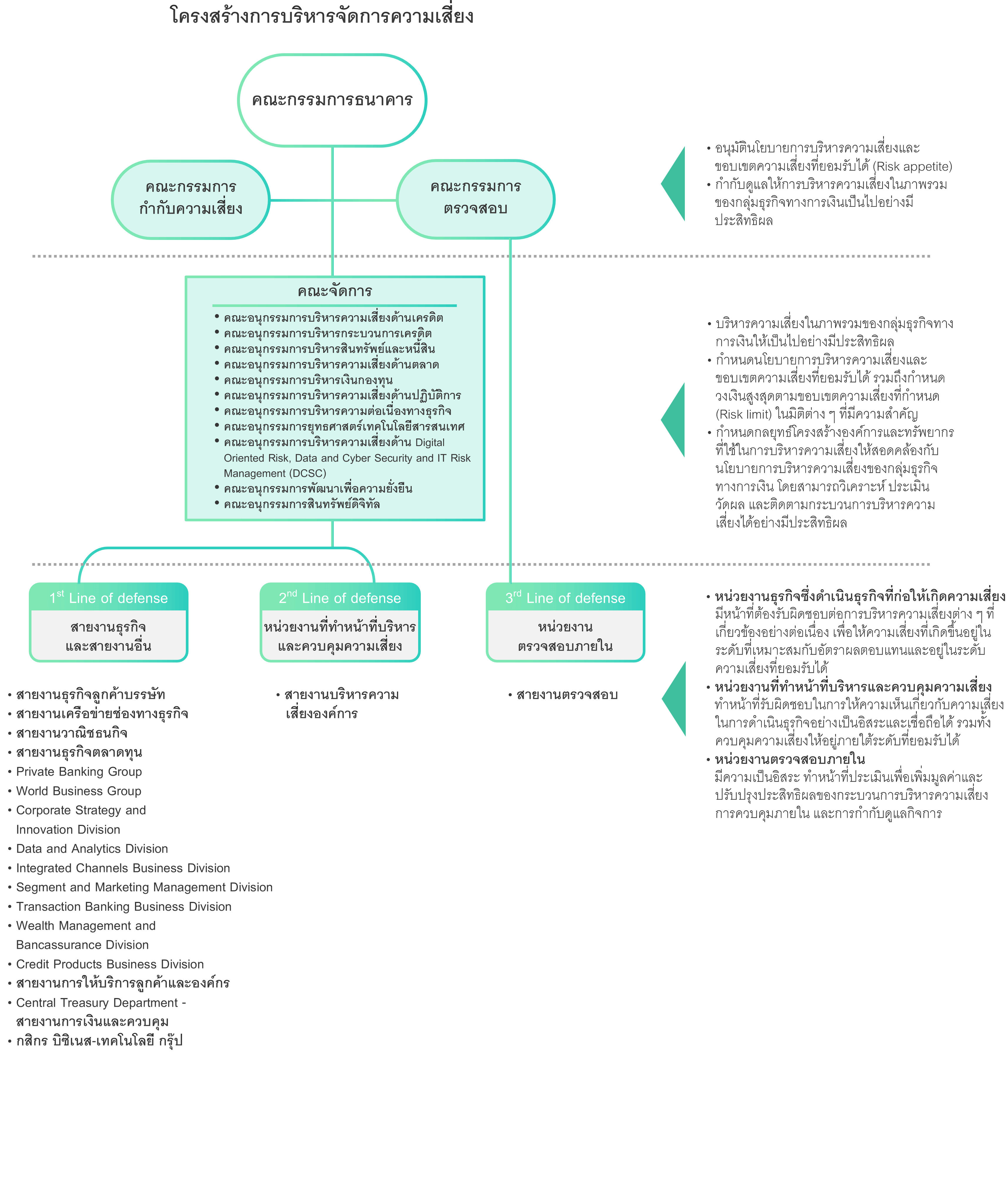 "ธนาคารสร้างวัฒนธรรมองค์กรที่คำนึงถึงความเสี่ยง ตั้งแต่การกำหนดนโยบายการบริหารความเสี่ยง ขอบเขตความเสี่ยงที่ยอมรับได้  เพดานความเสี่ยงและแนวทางการบริหารความเสี่ยงที่มีความสอดคล้องกับกลยุทธ์และการดำเนินธุรกิจของธนาคาร และสื่อความให้พนักงานในองค์กรทราบ โดยกำหนดโครงสร้างการกำกับดูแลและการบริหารความเสี่ยงที่ชัดเจนและเหมาะสม มีหน่วยงานบริหารความเสี่ยงที่ทำหน้าที่ควบคุมดูแลความเสี่ยงอย่างเป็นอิสระ และหน่วยธุรกิจมีหน้าที่รับผิดชอบต่อการบริหารความเสี่ยงต่างๆ ที่เกี่ยวข้องอย่างต่อเนื่อง เพื่อให้ความเสี่ยงที่เกิดขึ้นอยู่ในระดับที่เหมาะสมกับอัตราผลตอบแทนและอยู่ในระดับความเสี่ยงที่ยอมรับได้
