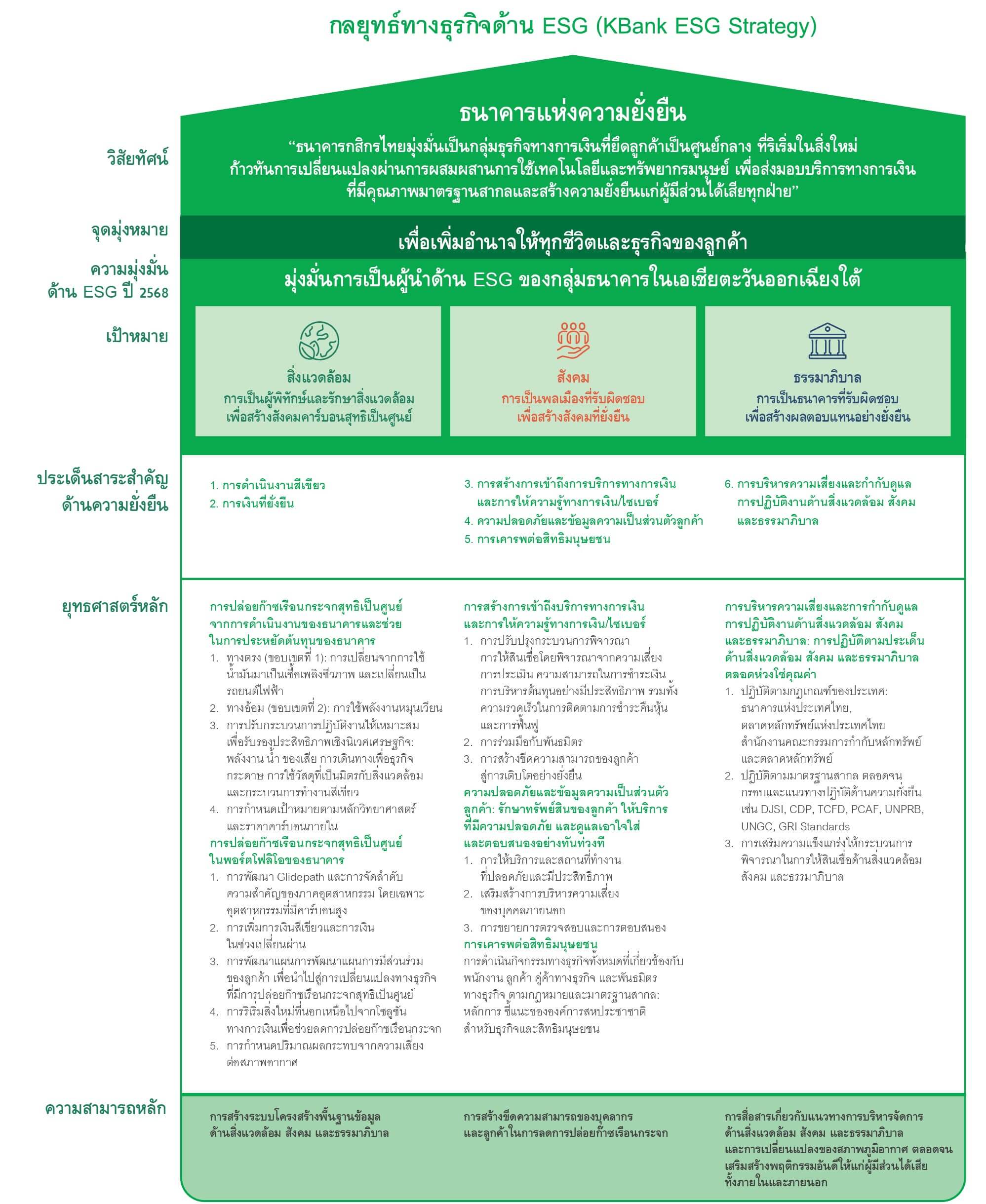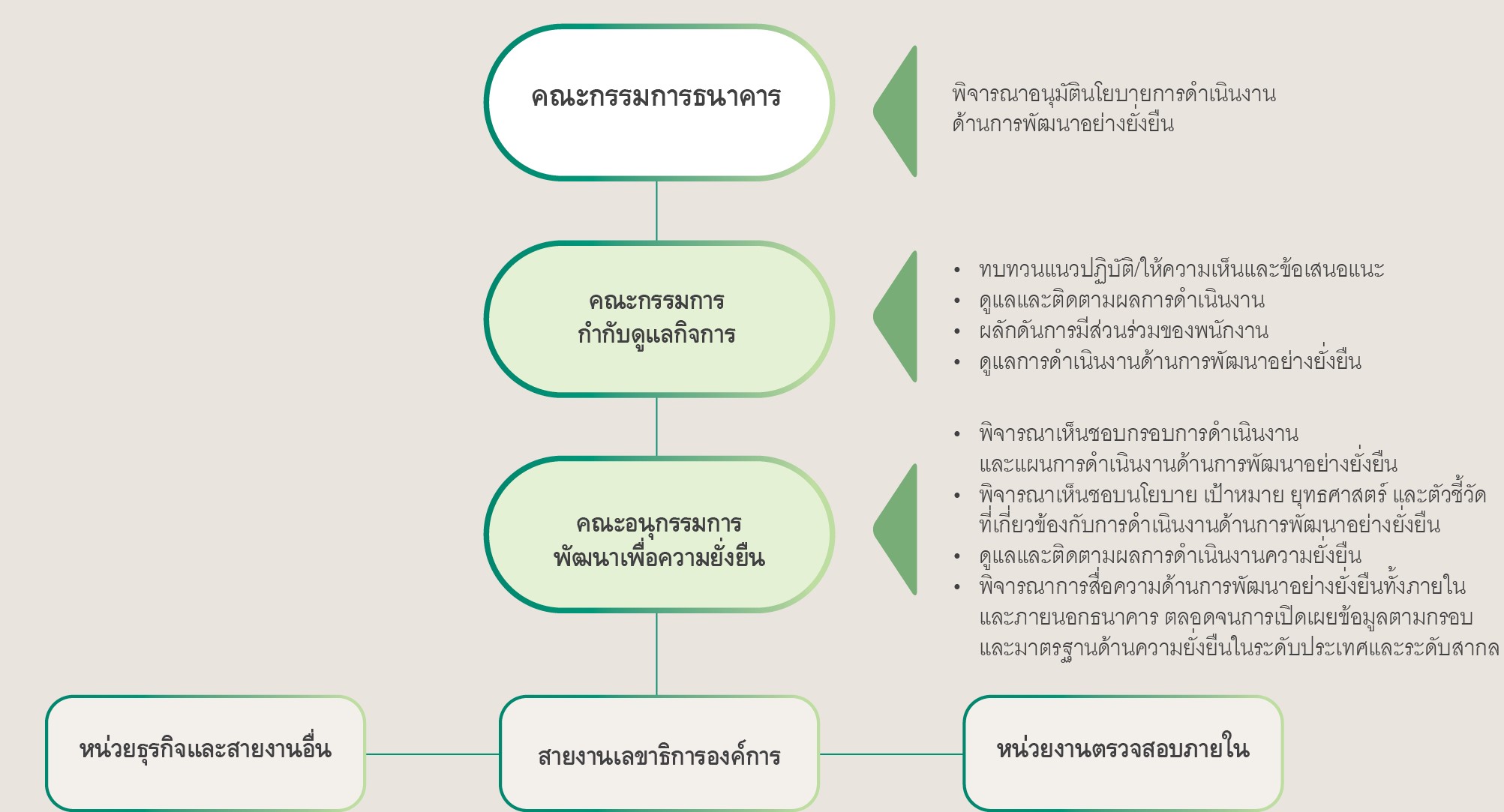 ธนาคารจัดตั้งคณะอนุกรรมการด้านการพัฒนาเพื่อความยั่งยืน โดยมีประธานเจ้าหน้าที่บริหารเป็นประธาน เพื่อขับเคลื่อนการดำเนินงานด้านสิ่งแวดล้อม สังคม ธรรมาภิบาล/เศรษฐกิจ (ESG) ภายใต้กรอบนโยบายการดำเนินงานด้านการพัฒนาอย่างยั่งยืน โดยมีภารกิจในการกำหนดกรอบและแผนงาน การกำกับ ดูแล ติดตาม และประเมินผลการดำเนินงานด้านการพัฒนาอย่างยั่งยืน